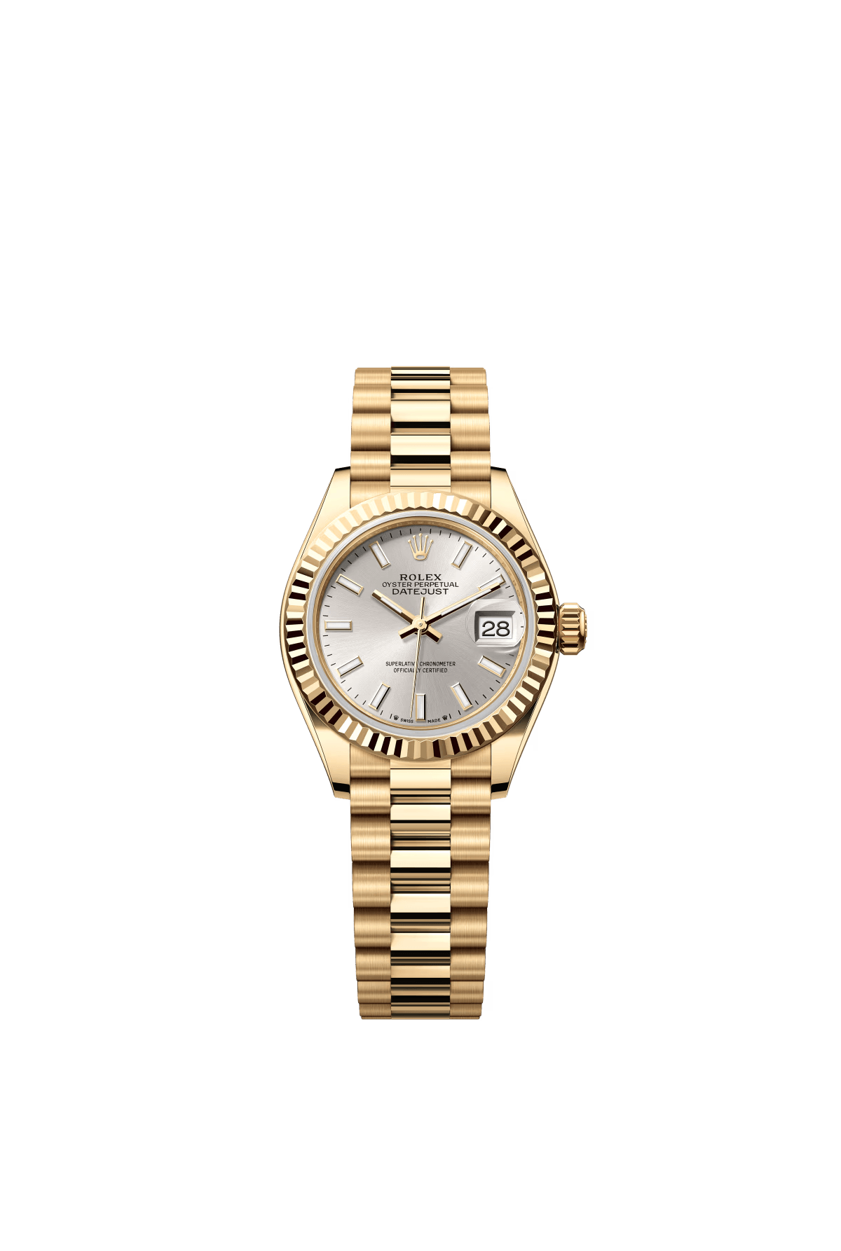 The Oyster Perpetual Lady-Datejust in 18 ct yellow gold with a silver dial and President bracelet. -m279138rbr-0017 28mm