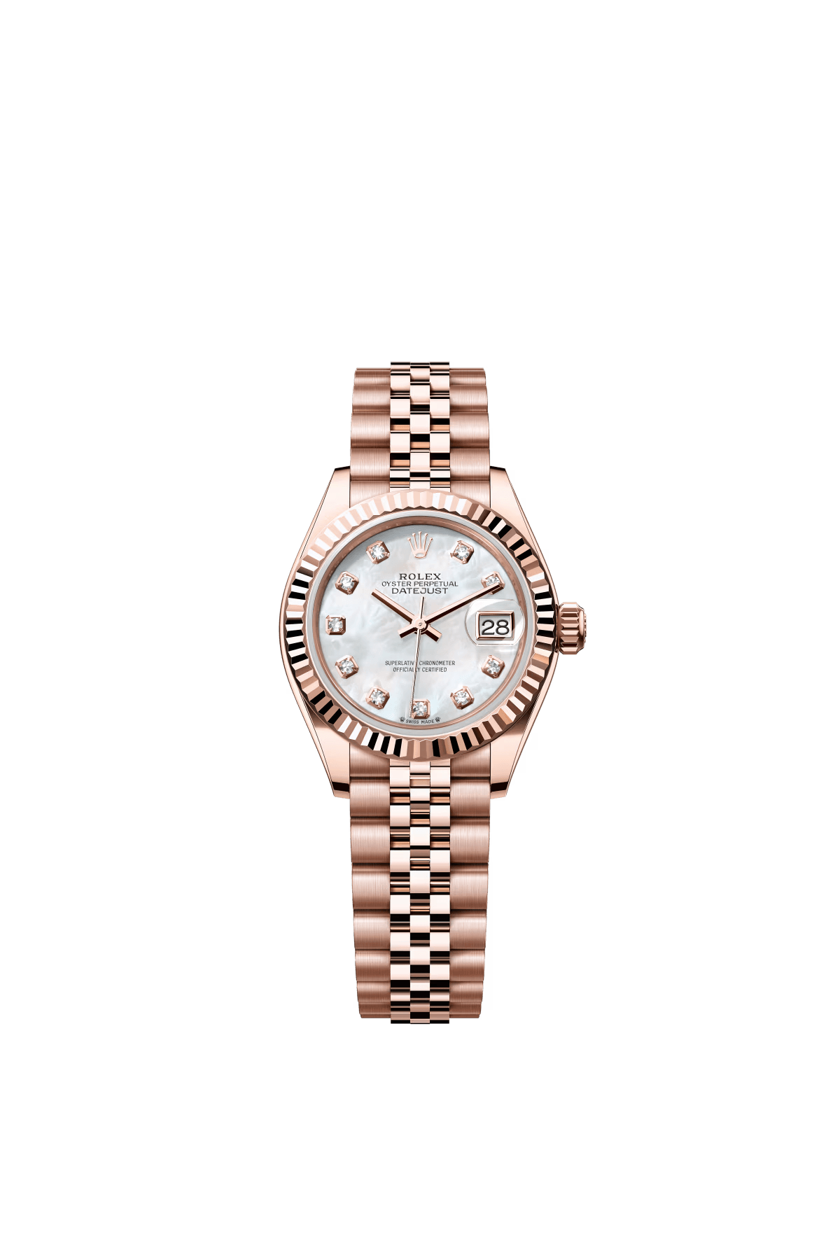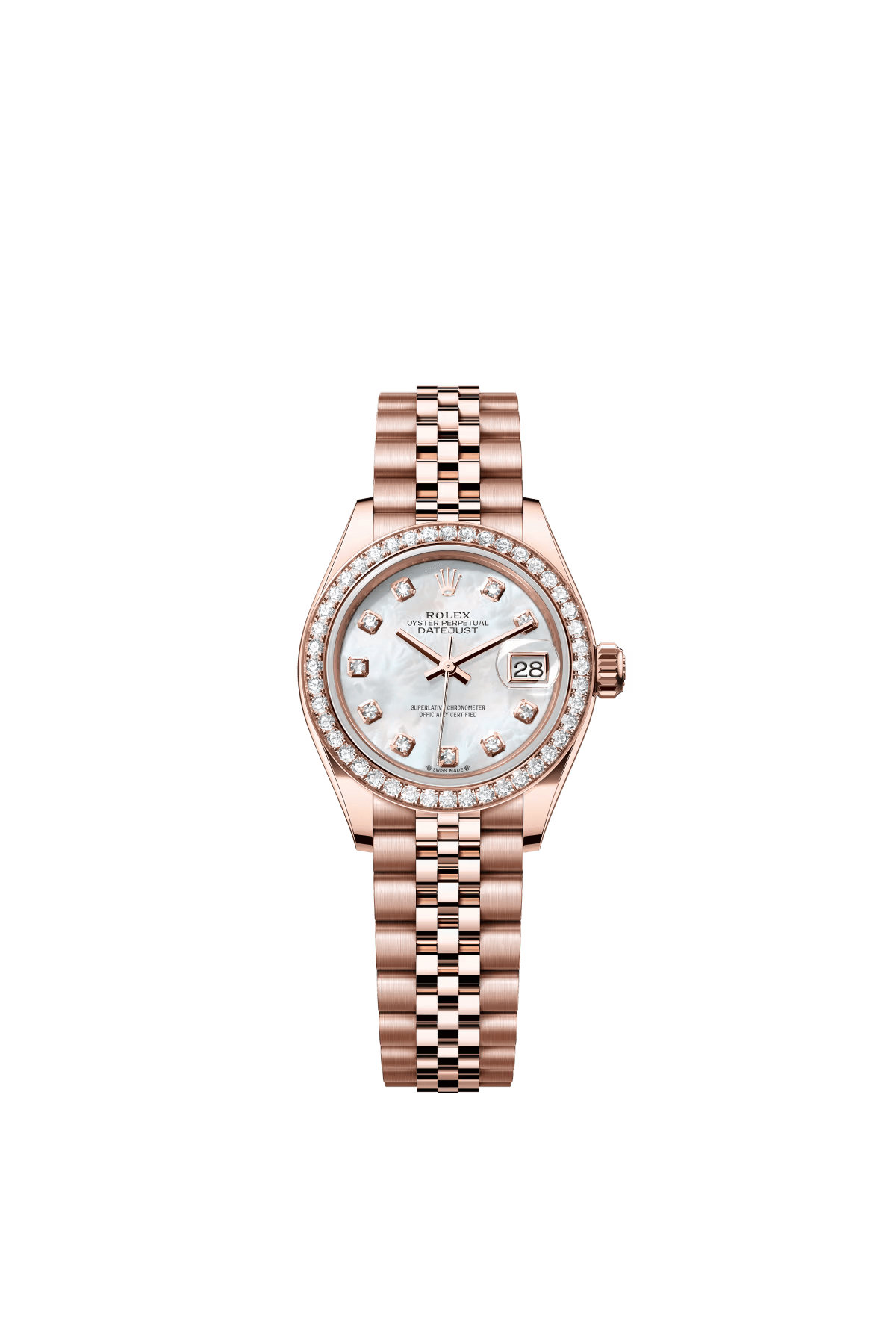 The Oyster Perpetual Lady-Datejust in 18-carat Everose gold with a diamond-set white mother-of-pearl dial and a Jubilee bracelet. -m279135rbr-0019 28mm