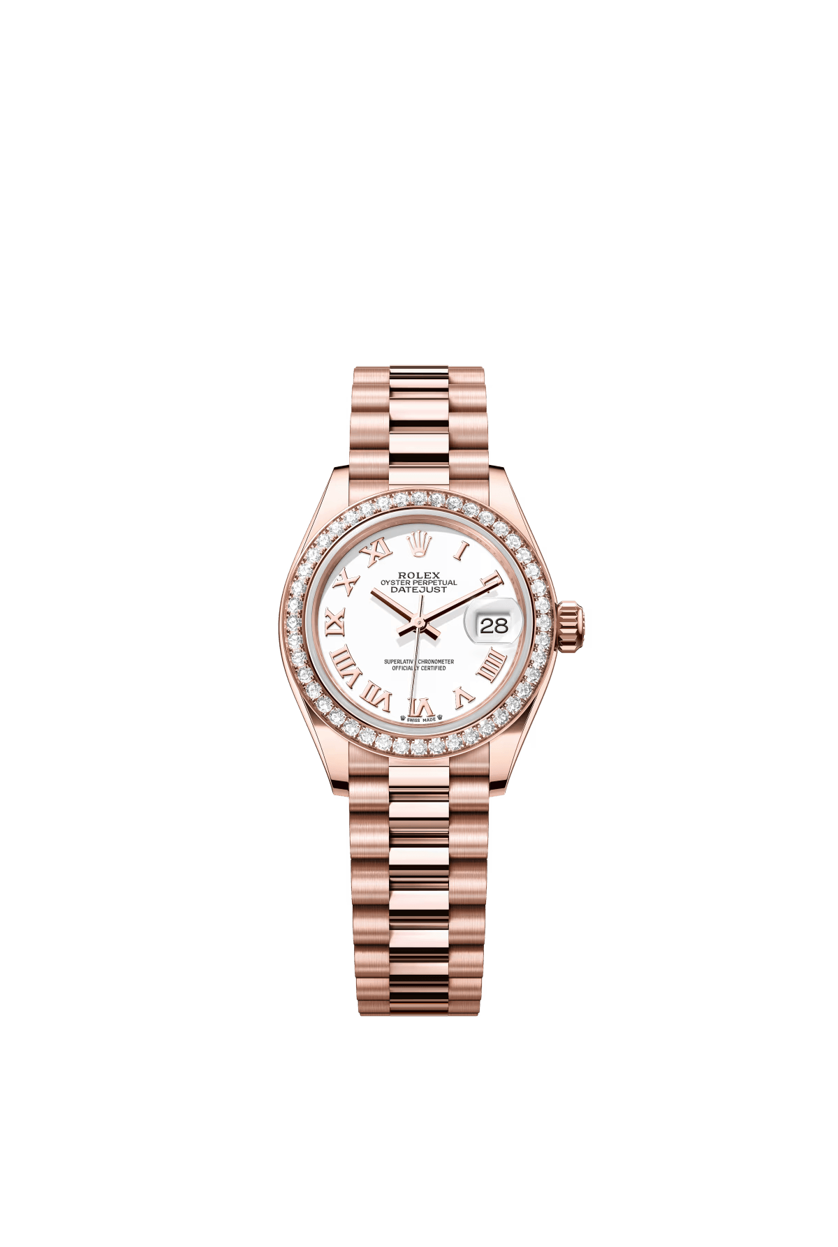 The Oyster Perpetual Lady-Datejust in 18 ct Everose gold with a diamond-set white mother-of-pearl dial and a President bracelet. -m279175-0017 28mm
