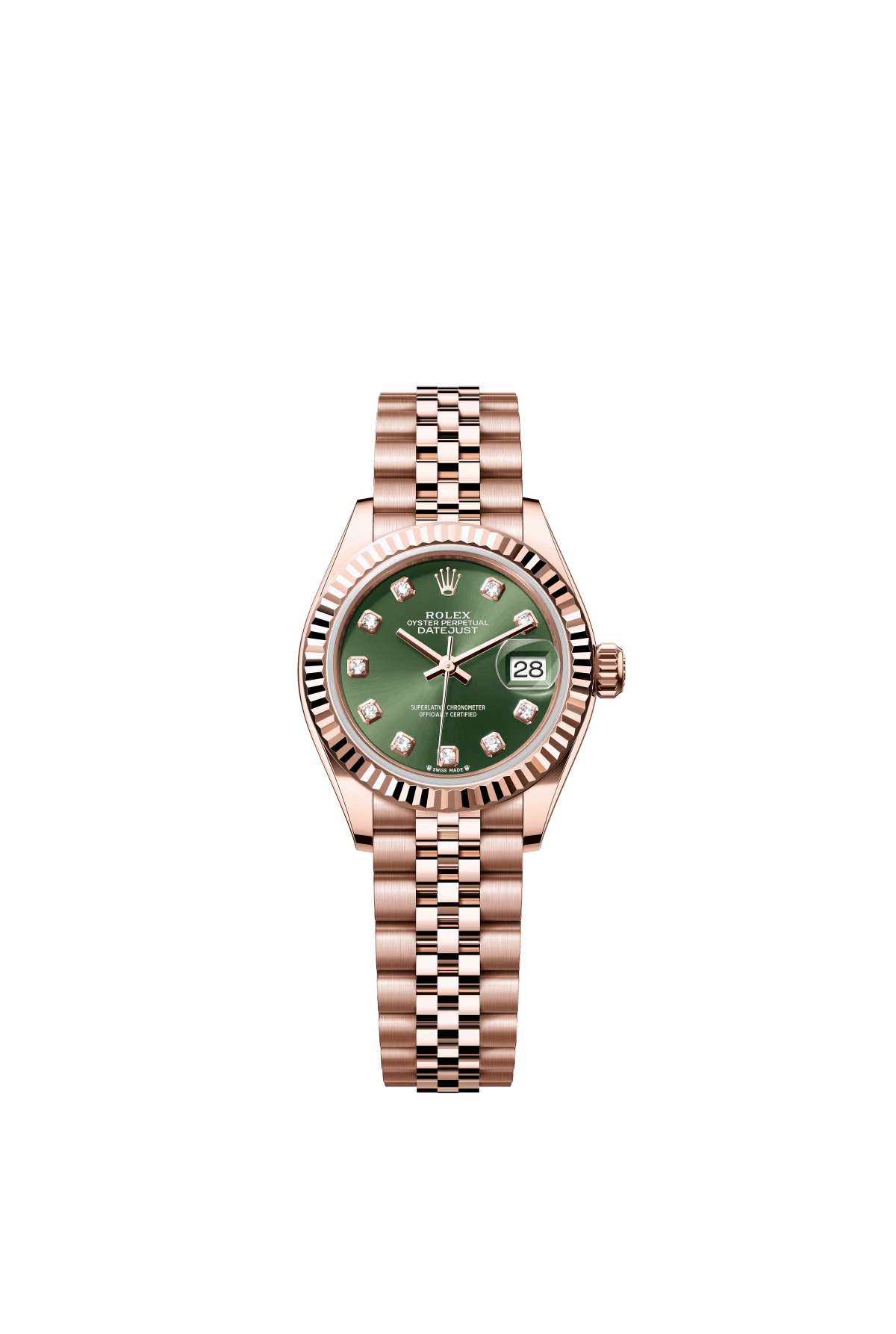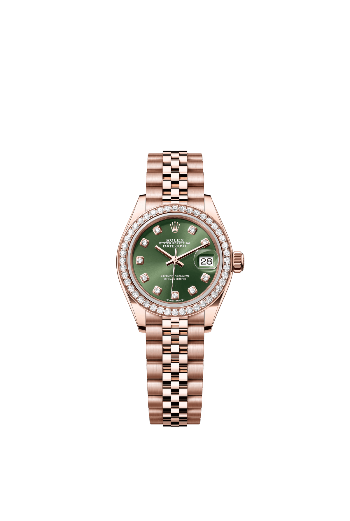 The Oyster Perpetual Lady-Datejust in 18 ct Everose gold with a diamond-set olive green dial and a Jubilee bracelet. -m279135rbr-0015 28mm