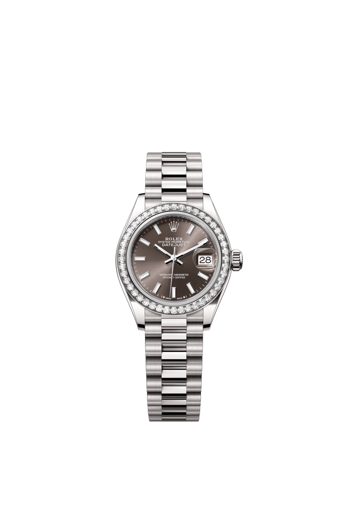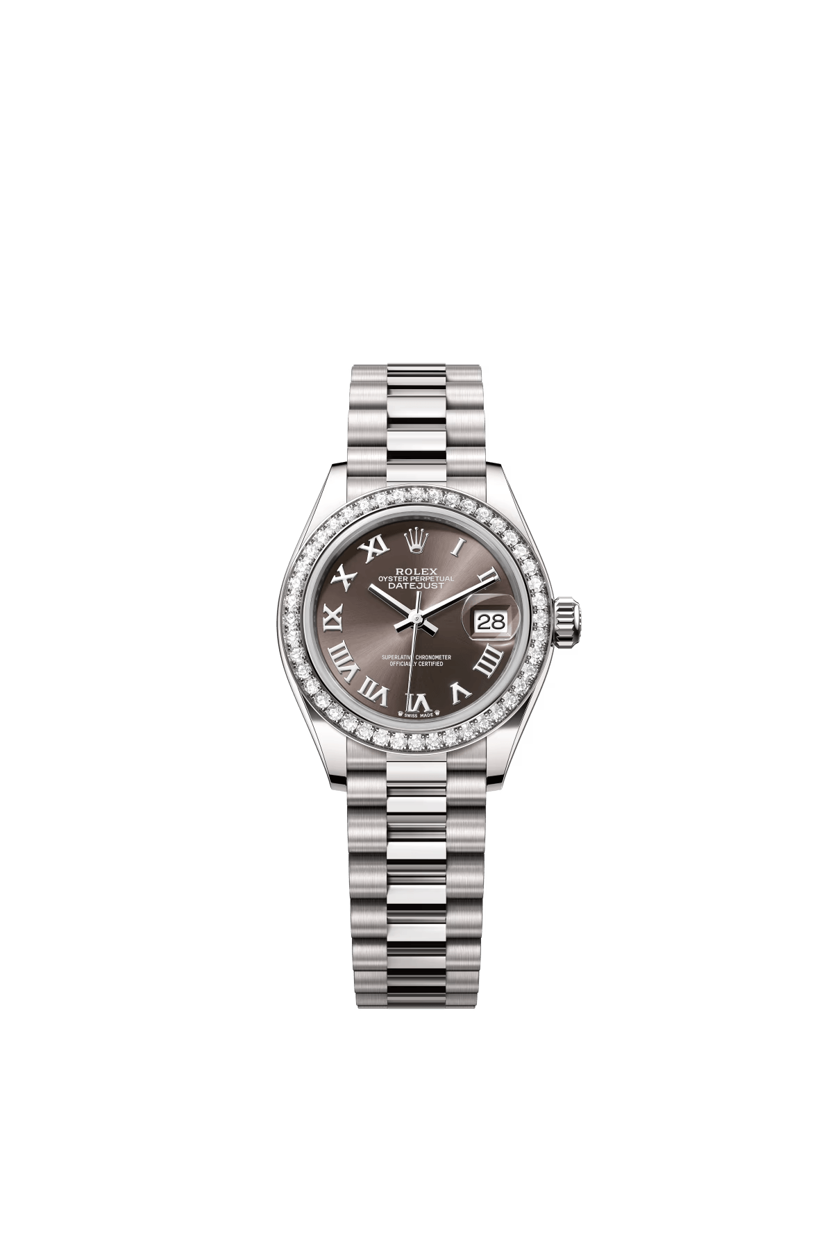 The Oyster Perpetual Lady-Datejust in 18K white gold with a dark grey dial and President bracelet. -m279139rbr-0010 28mm