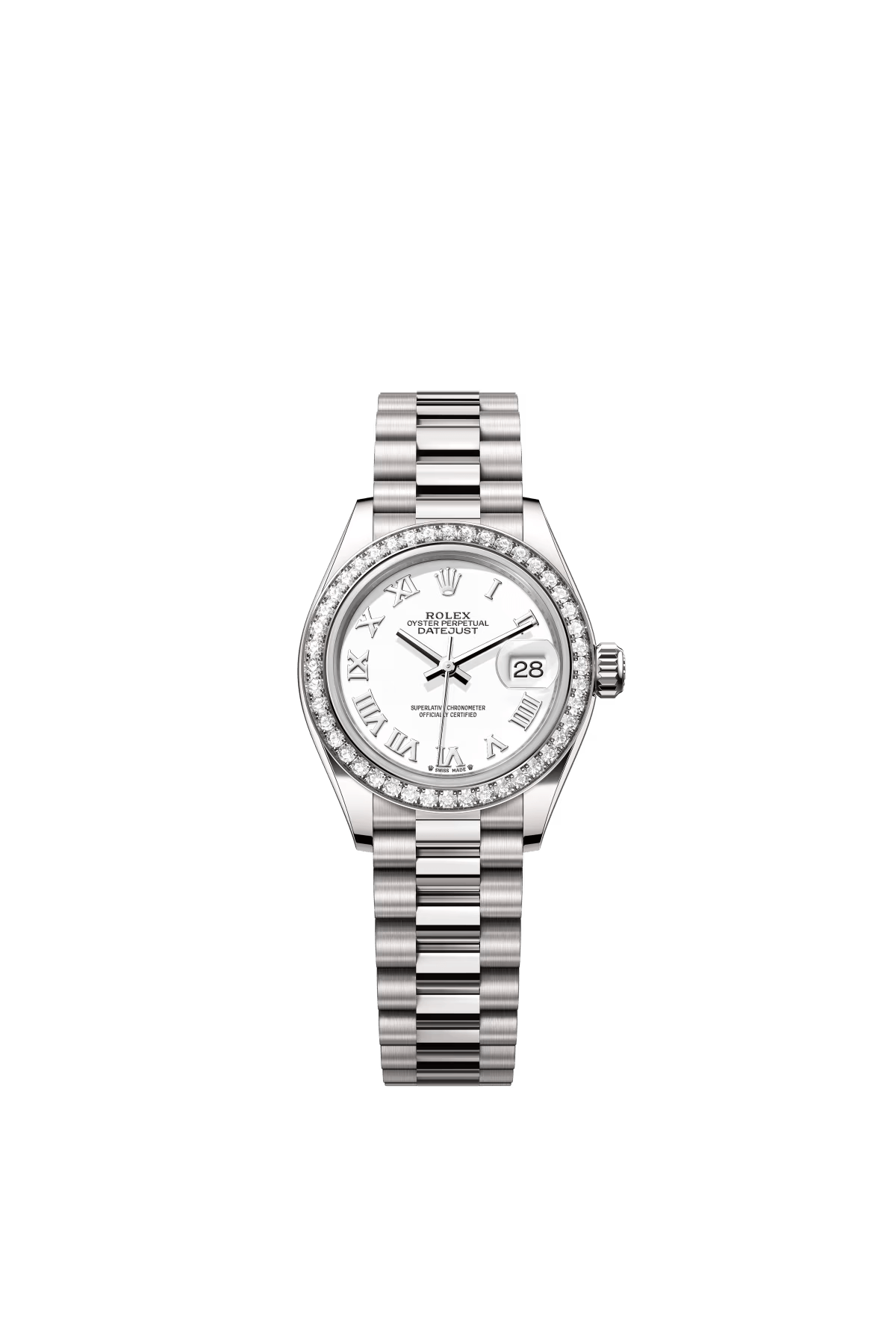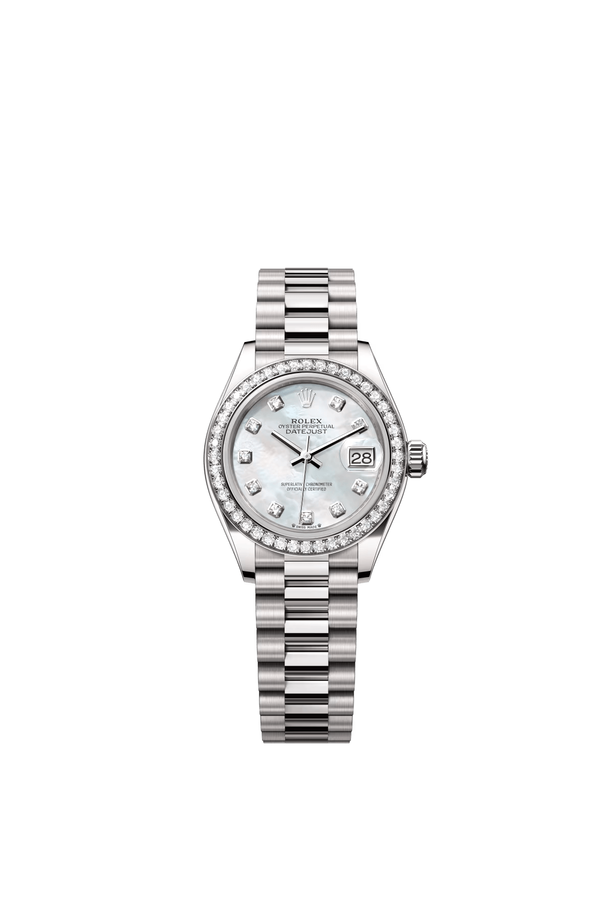 The Oyster Perpetual Lady-Datejust in 18 ct white gold with a diamond-set white mother-of-pearl dial and President bracelet. -m279139rbr-0008 28mm