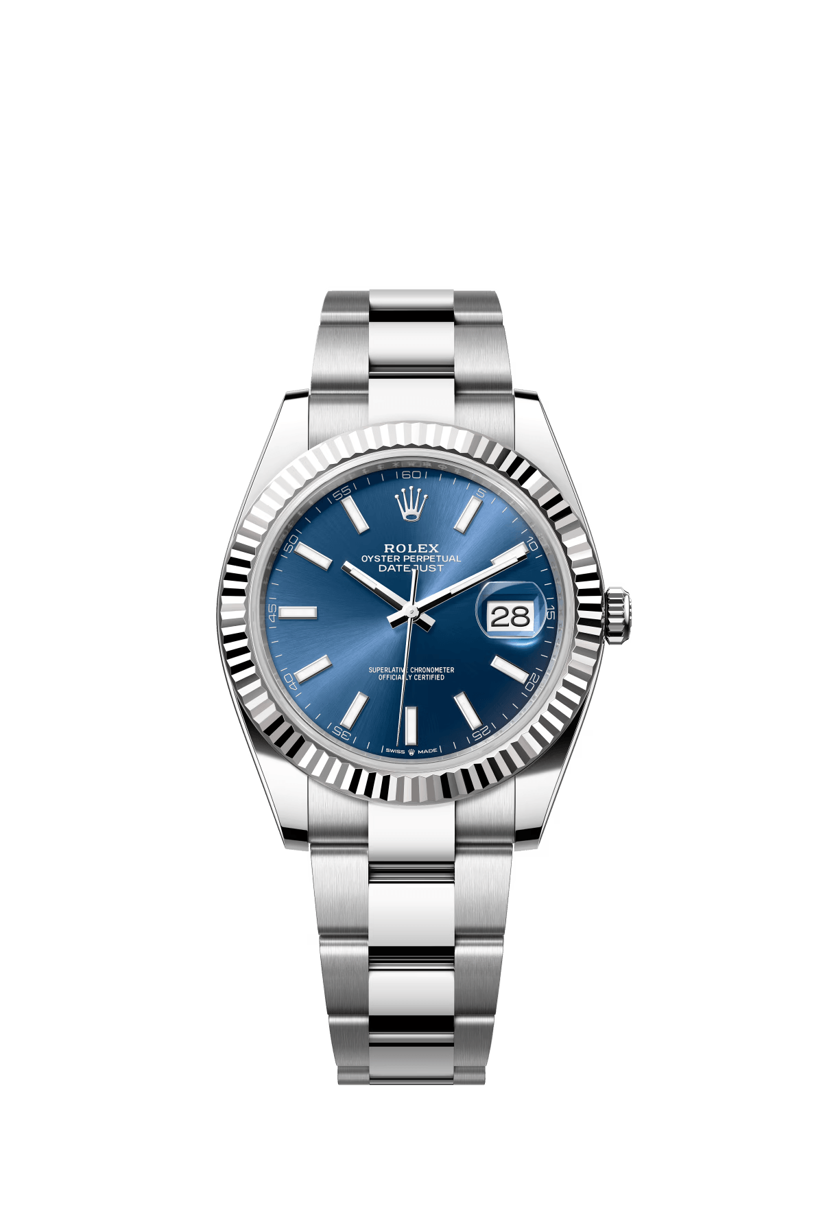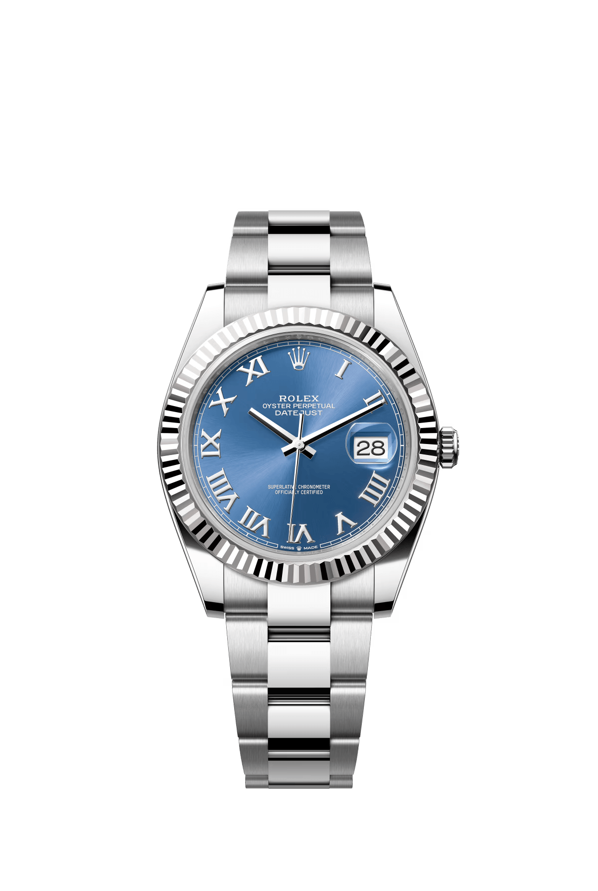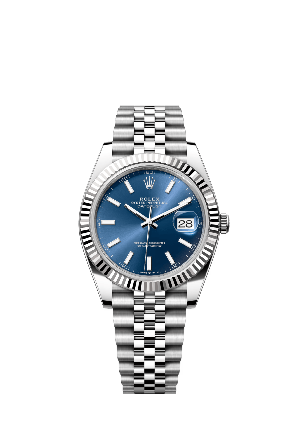 The Oyster Perpetual Datejust 41 is available in white gold and Oystersteel with a bright blue dial and an Oyster bracelet. -m126334-0001