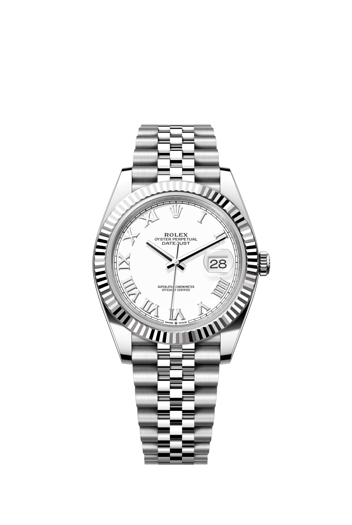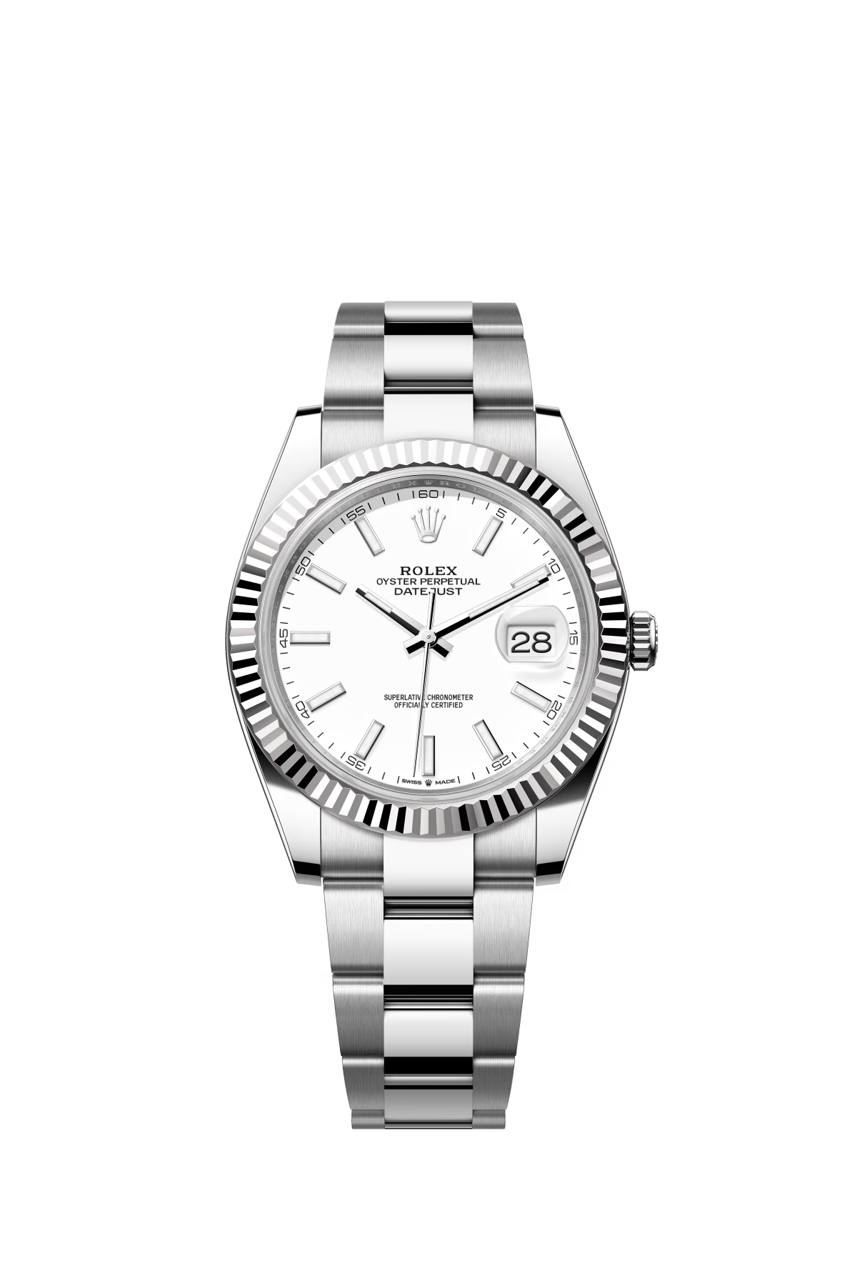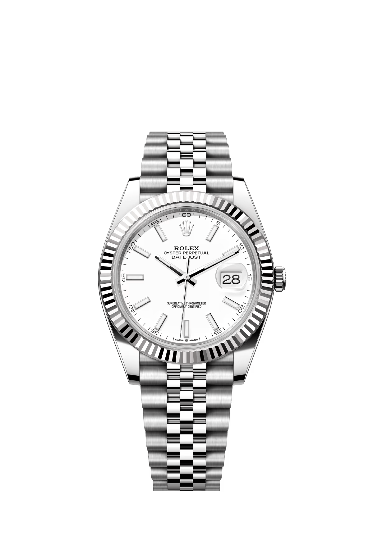 The Oyster Perpetual Datejust 41 is available in white gold and Oystersteel with a white dial and Oyster bracelet. -m126334-0023