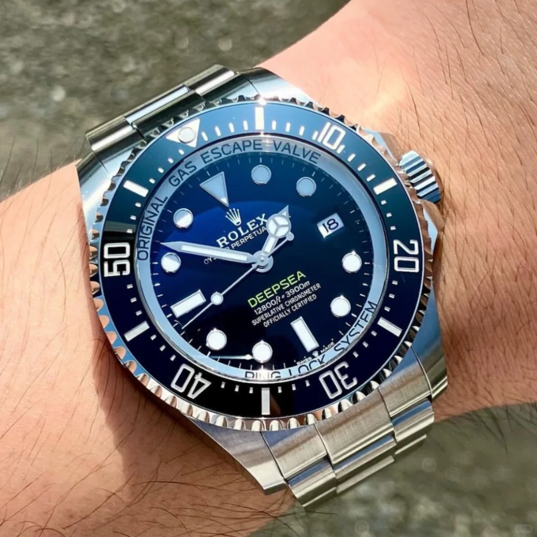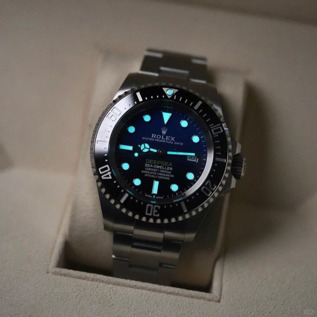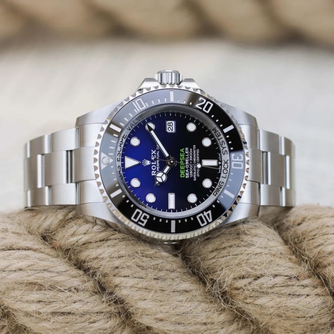 The Oyster Perpetual Rolex Deepsea in Oystersteel with a Cerachrom bezel insert in black ceramic and an Oyster bracelet.