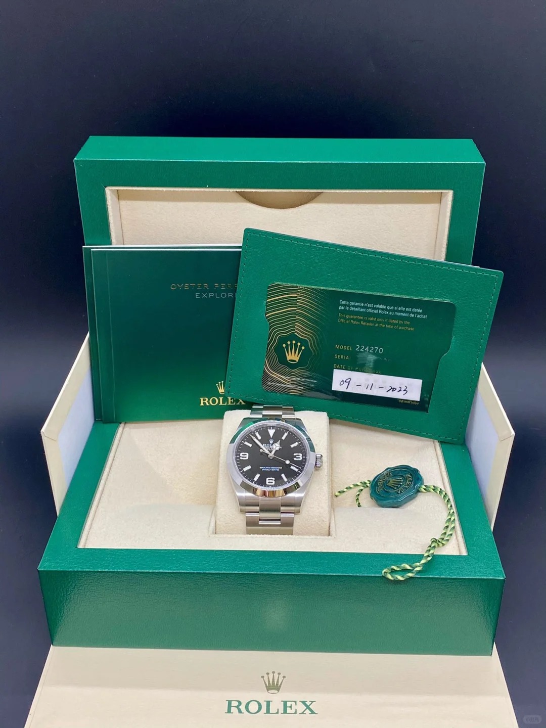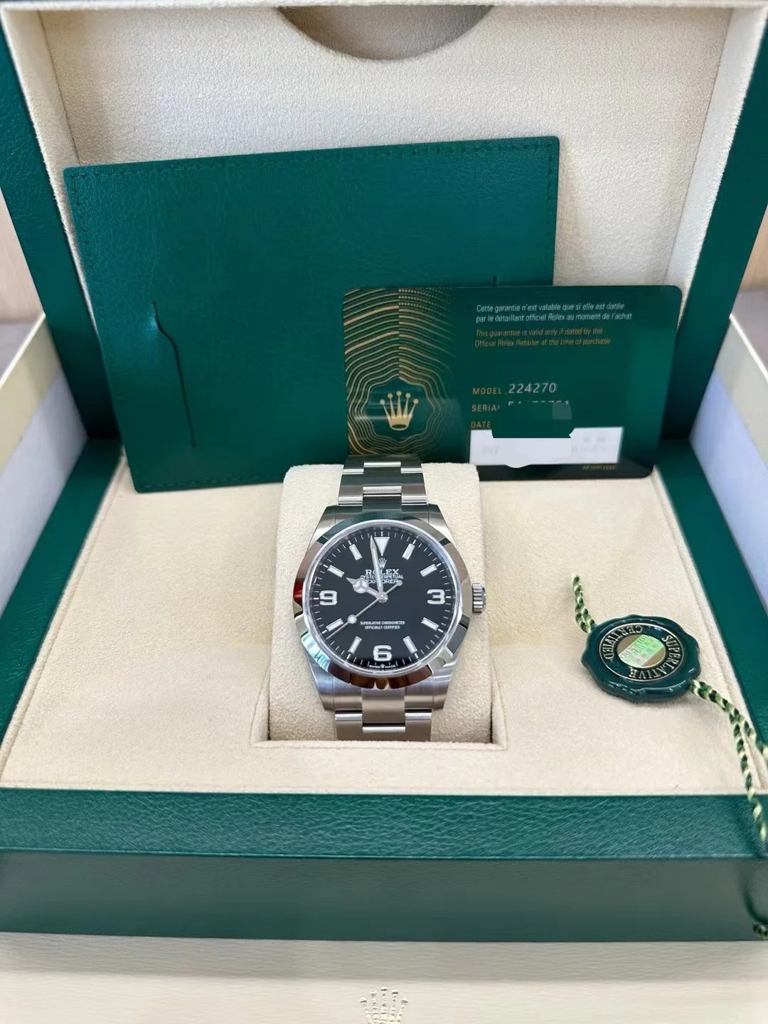 The Oyster Perpetual Explorer 40 is made of Oyster steel with a distinctive black dial featuring the 3, 6 and 9 numerals coated with Chromalight. -m224270-0001