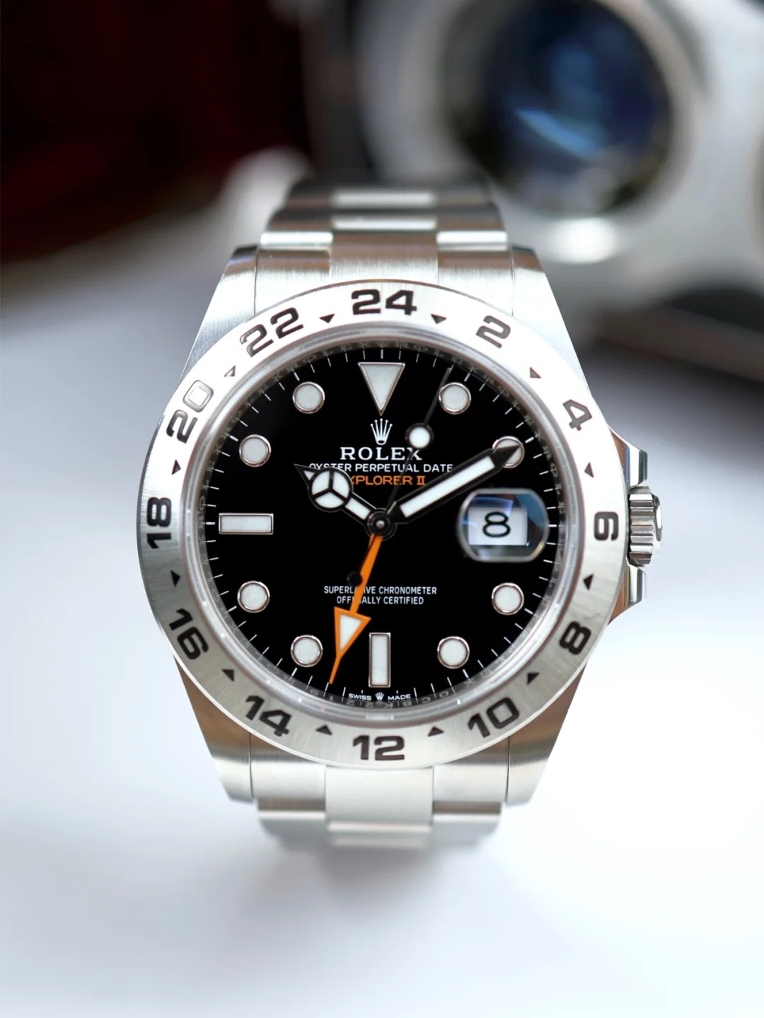 The Oyster Perpetual Explorer II is made of Oyster steel with an Oyster bracelet and a black dial with arrow-shaped 24-hour hands and hour markers coated with Chromalight. -m226570-0002 42mm