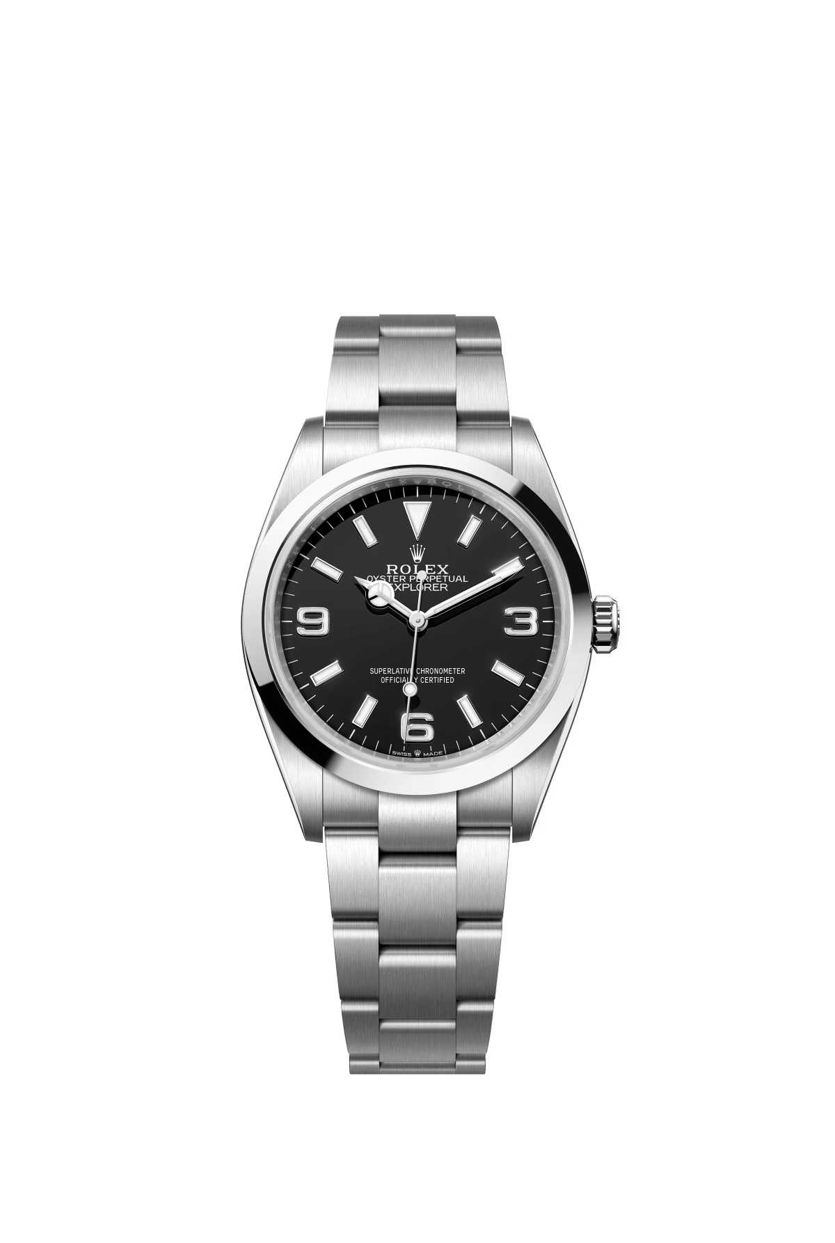 The Oyster Perpetual Explorer 36 is made of Oyster steel and features a distinctive black dial featuring the 3, 6 and 9 numerals coated with Chromalight. -m124270-0001
