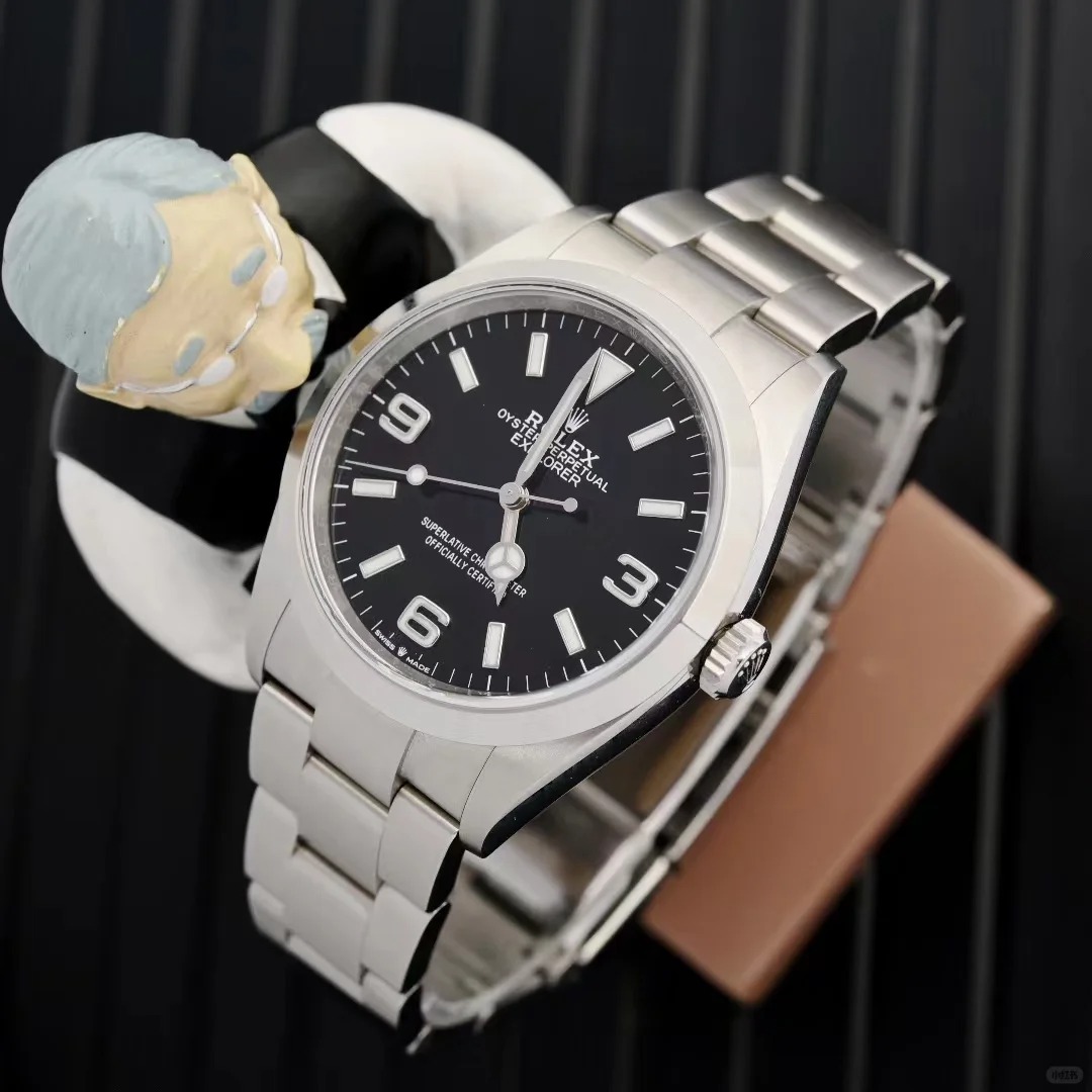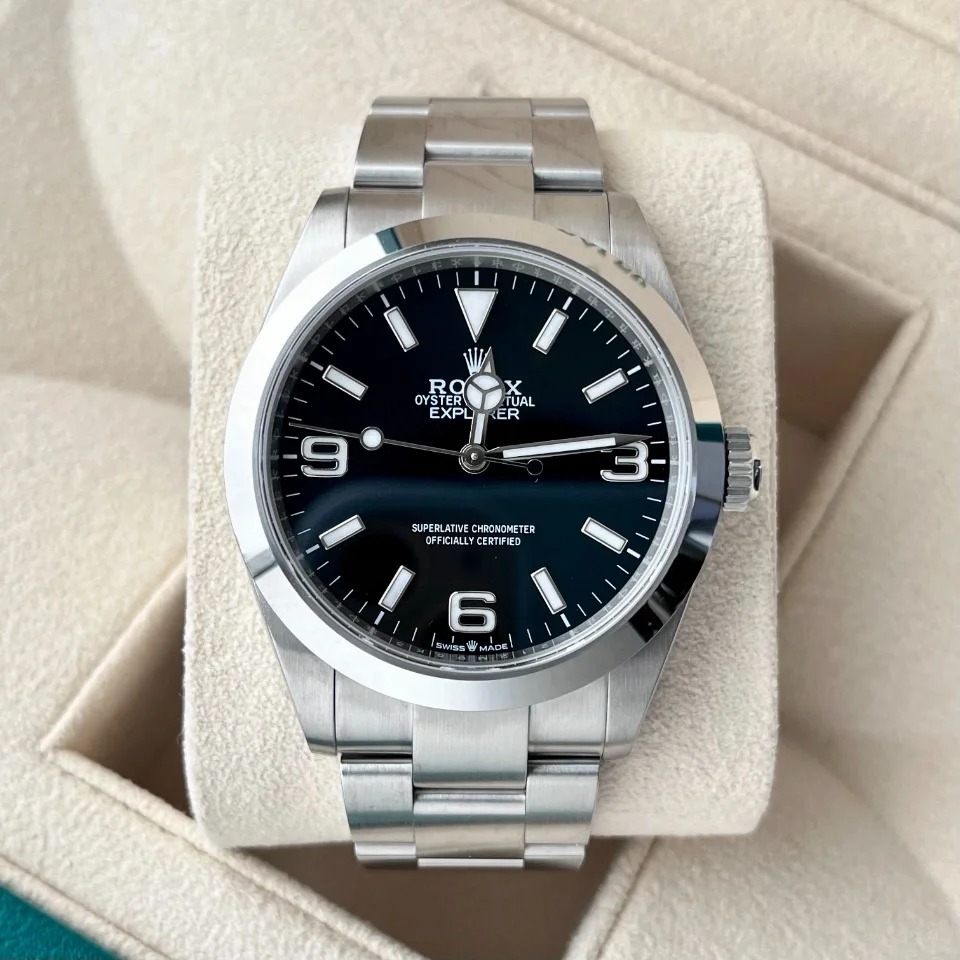 The Oyster Perpetual Explorer 40 is made of Oyster steel with a distinctive black dial featuring the 3, 6 and 9 numerals coated with Chromalight. -m224270-0001