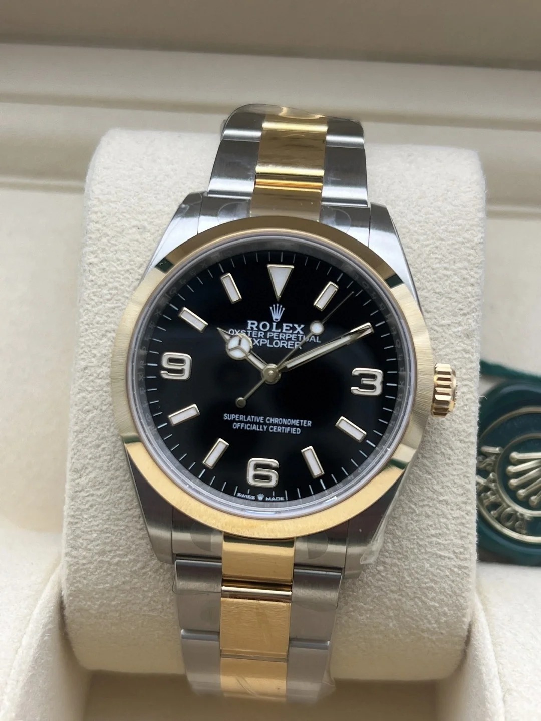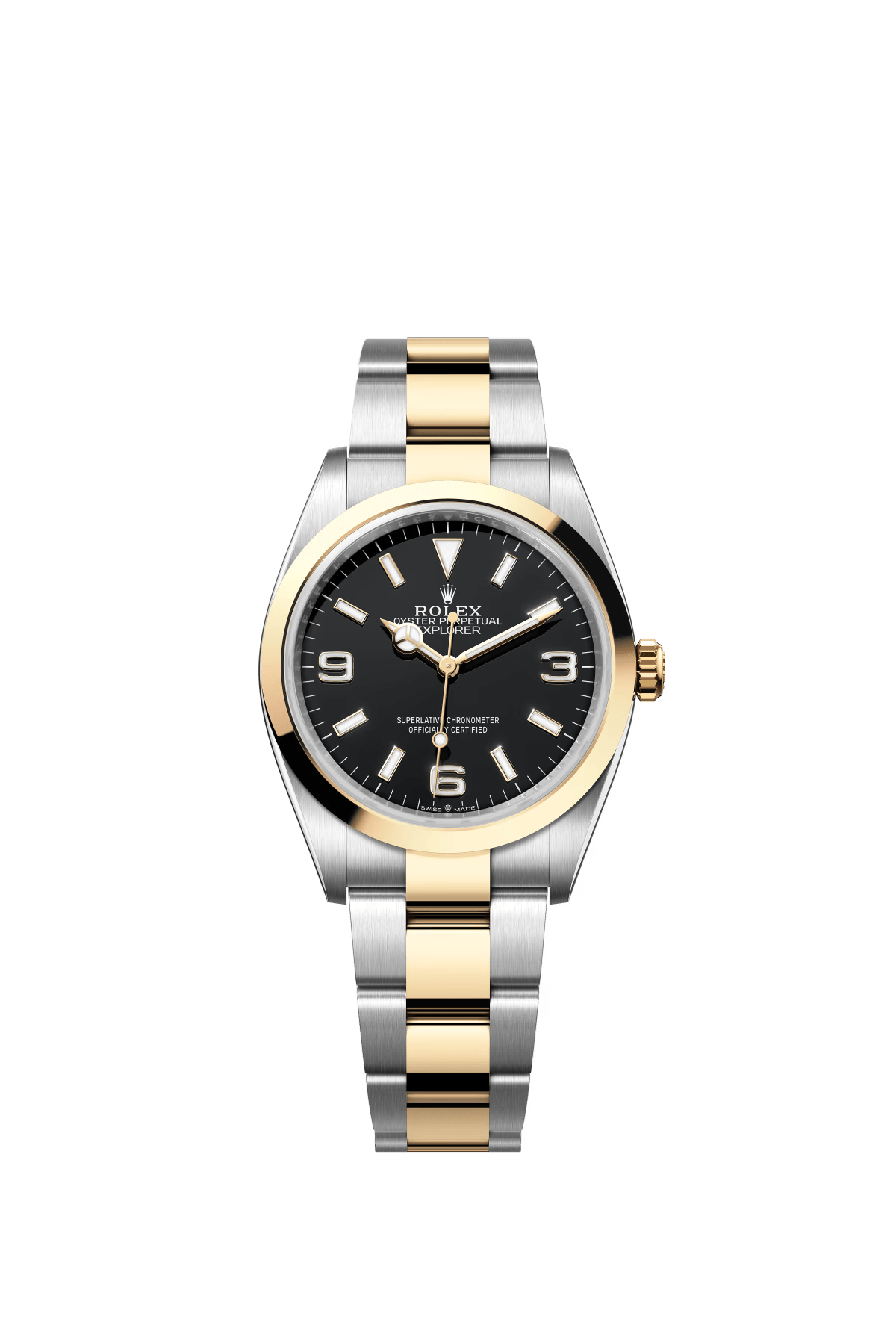 The Oyster Perpetual Explorer 36 is available in yellow gold and Oystersteel with a distinctive black dial featuring Chromalight numerals 3, 6 and 9. -m124273-0001
