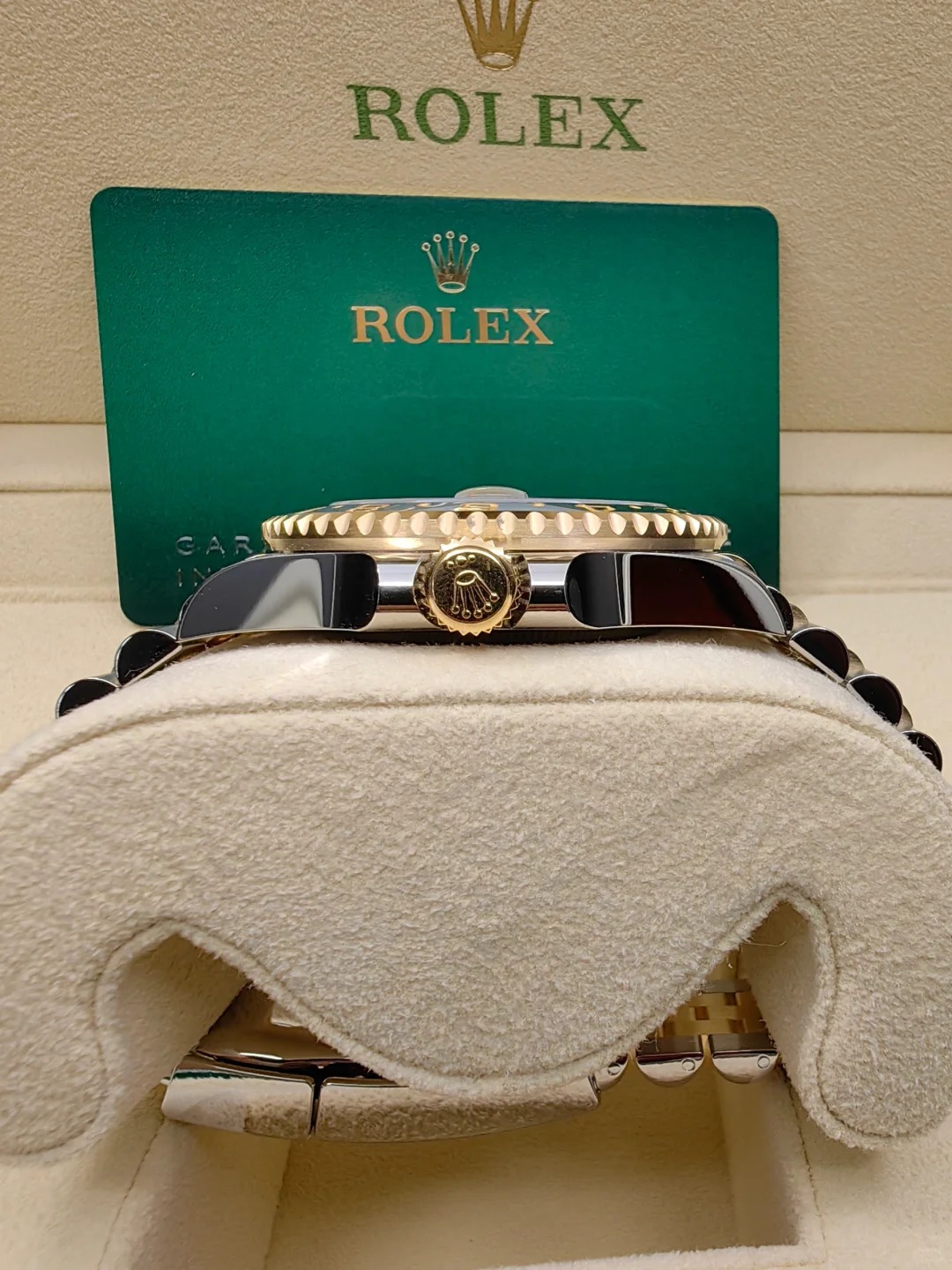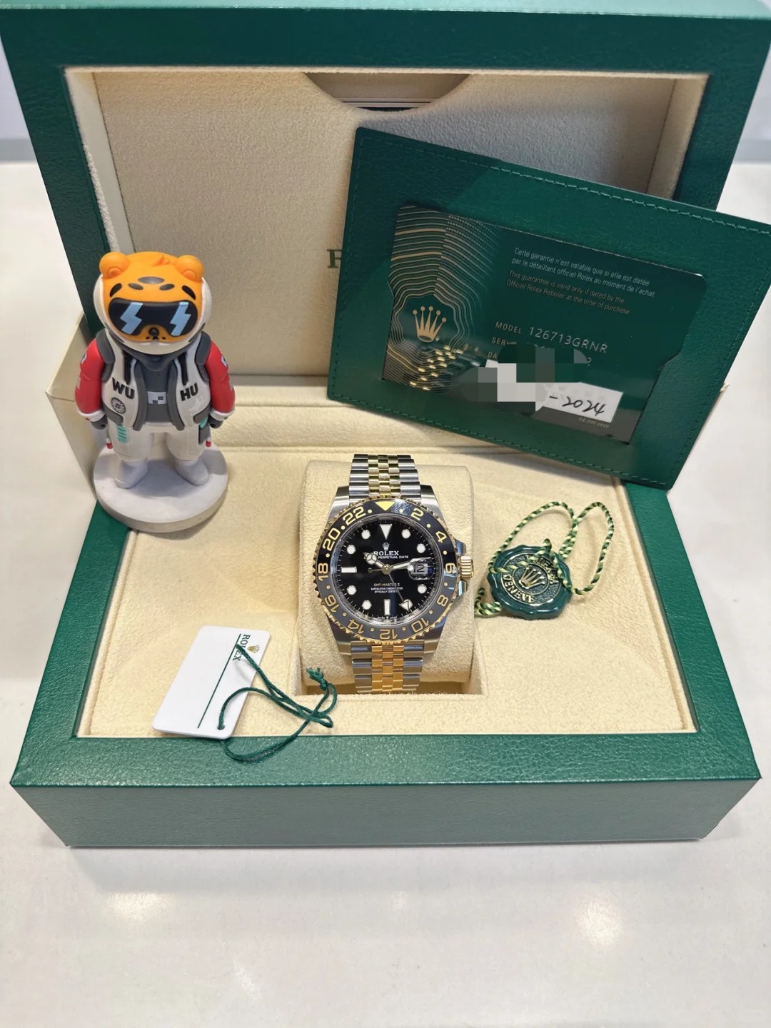 The Oyster Perpetual GMT-Master II is available in yellow gold and Oystersteel with a black dial and a Jubilee bracelet. -m126713grnr-0001 40mm