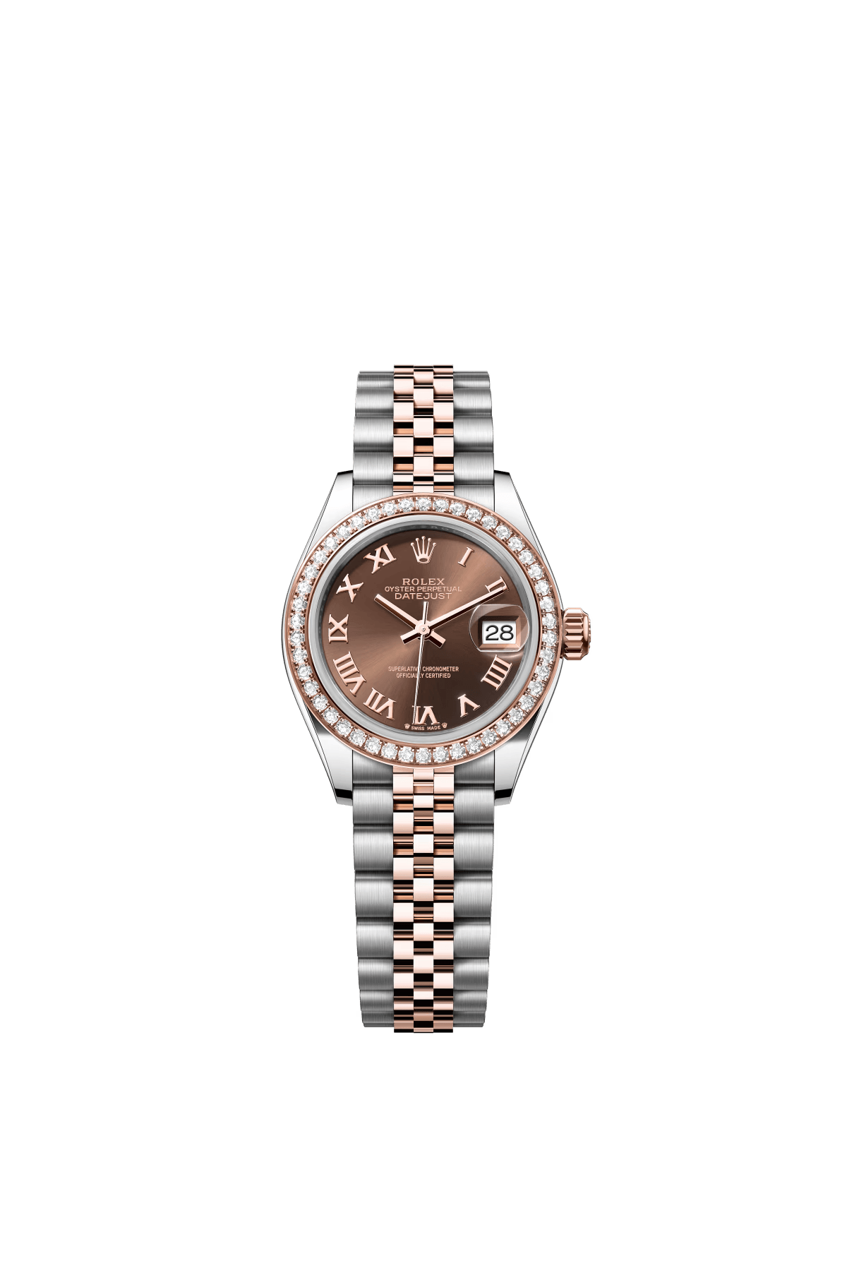 The Oyster Perpetual Lady-Datejust is available in Everose gold and Oystersteel with a chocolate-coloured dial and a Jubilee bracelet. -m279381rbr-0017 28mm