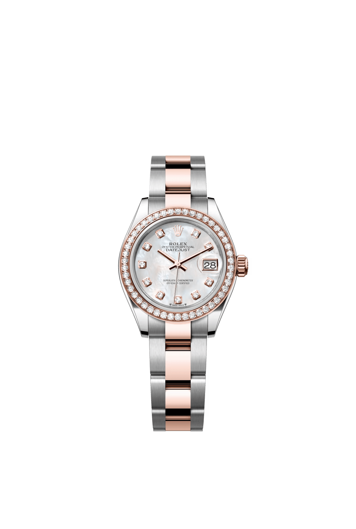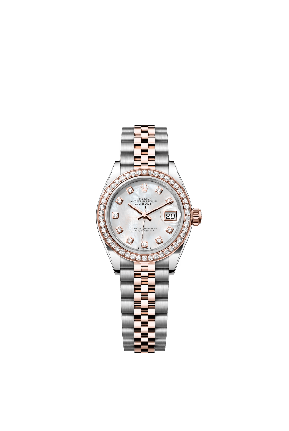 The Oyster Perpetual Lady-Datejust in Everose gold and Oystersteel features a diamond-set white mother-of-pearl dial and an Oyster bracelet. -m279381rbr-0014 28mm