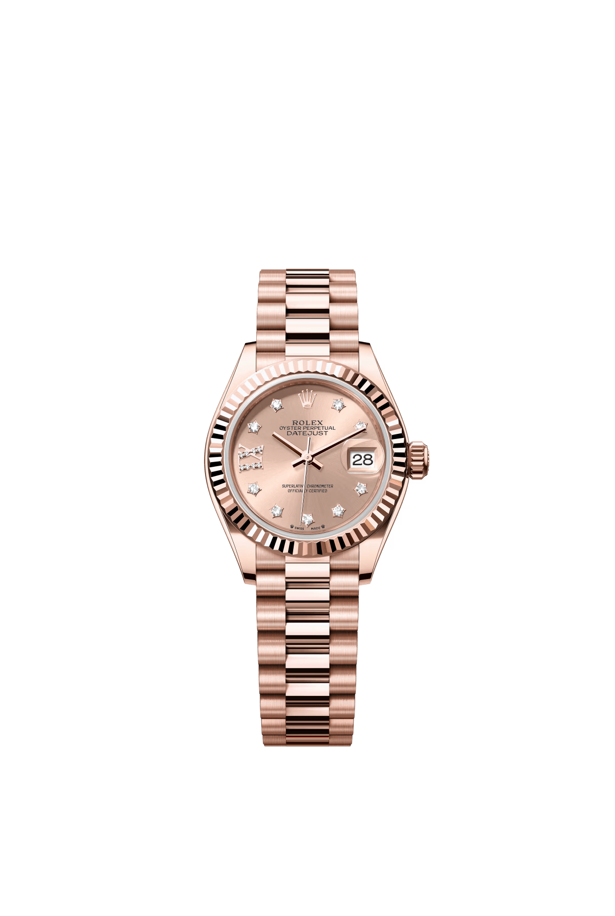The Oyster Perpetual Lady-Datejust in 18 ct Everose gold with a diamond-set white mother-of-pearl dial and a President bracelet. -m279135rbr-0010 28mm