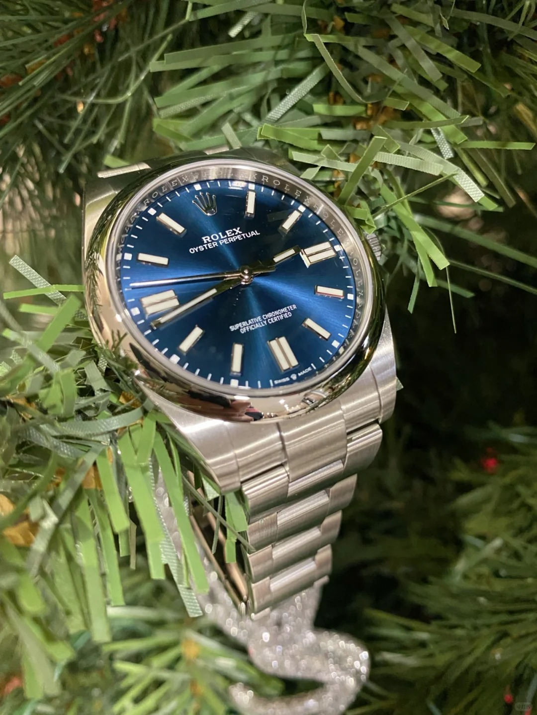 The Oyster Perpetual 41 with a bright blue dial and an Oyster bracelet.