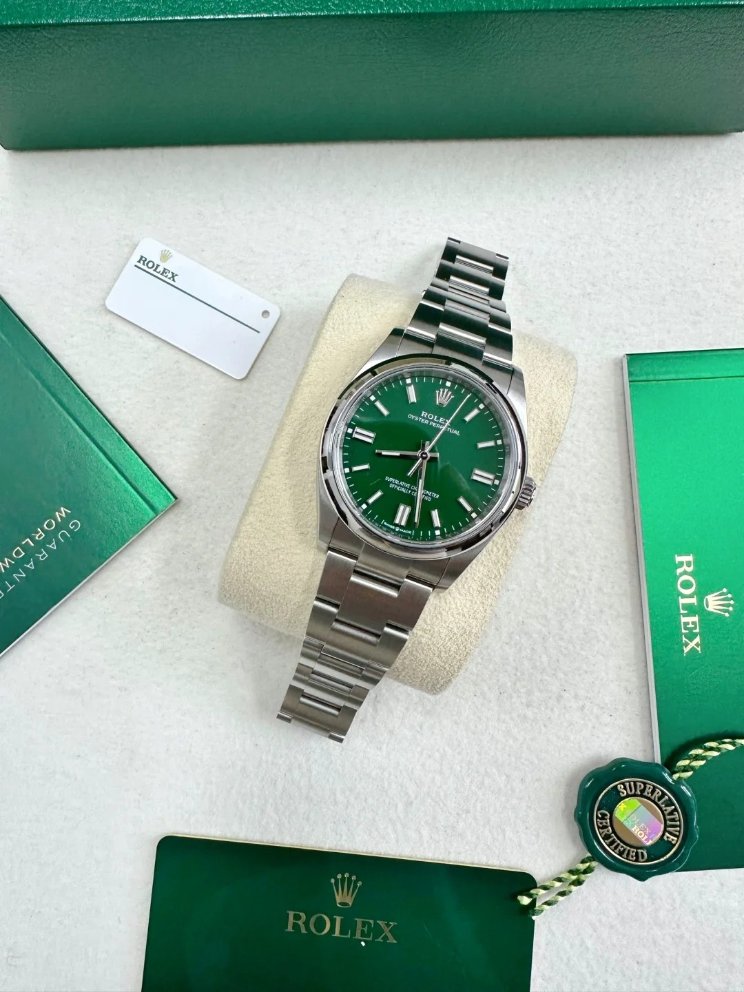 The Oyster Perpetual 36 with a green dial and an Oyster bracelet.