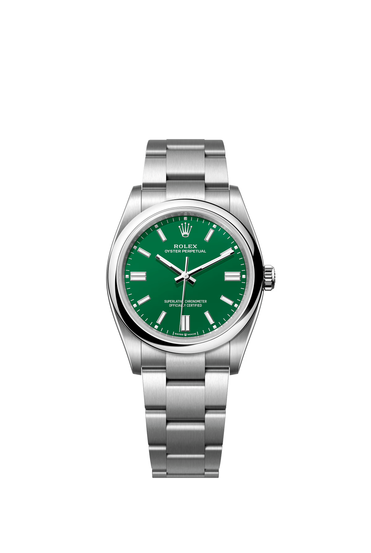 The Oyster Perpetual 36 is presented with a green dial and an Oyster bracelet. -m126000-0005