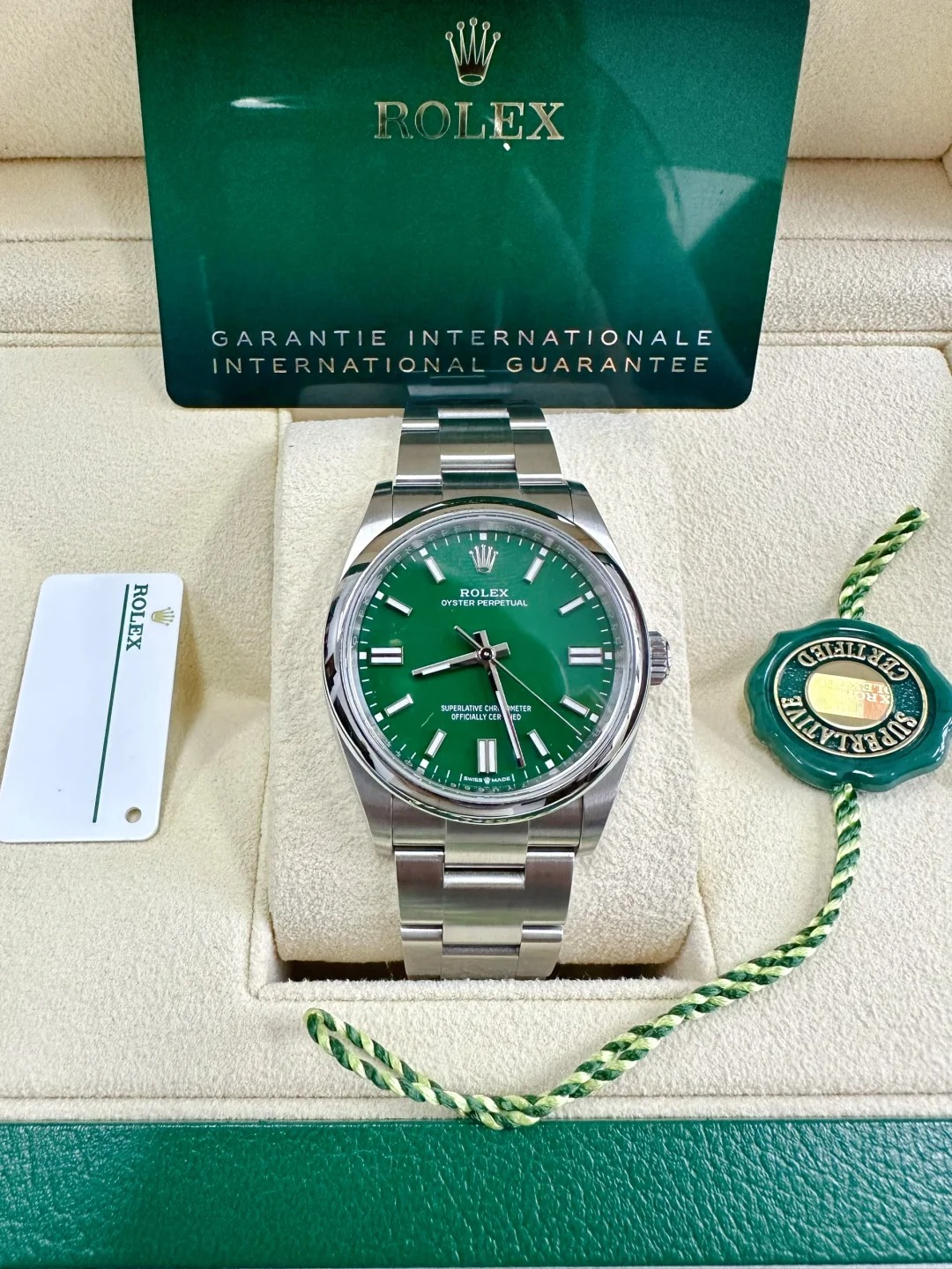 The Oyster Perpetual 41 is presented with a green dial and an Oyster bracelet. -m124300-0005