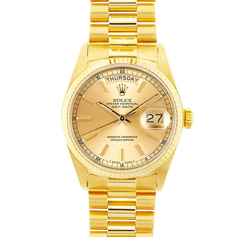 Rolex Oyster Perpetual Presidential Watch, 18K yellow gold, champagne dial, fluted bezel, presidential bracelet, men's 36mm
