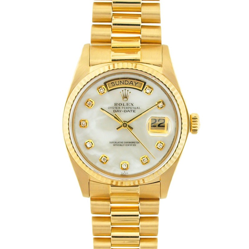 Rolex Oyster Perpetual Head of State, 18K yellow gold, custom white mother-of-pearl dial with custom diamond indexes, head bracelet, men's 36mm