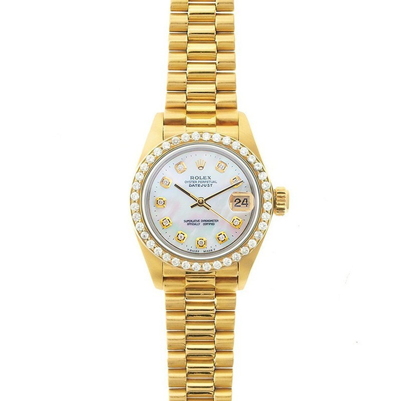 Rolex Oyster Perpetual Head of State Watch, 18K yellow gold, custom white mother-of-pearl dial with custom diamond indexes, Head bracelet, women's 28mm