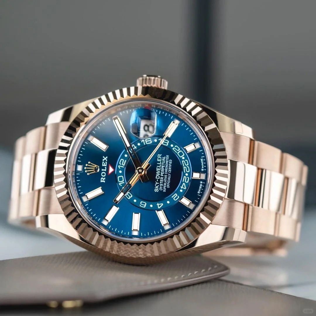 The Oyster Perpetual Sky-Dweller in 18 ct Everose gold with a blue-green dial and an Oyster bracelet.