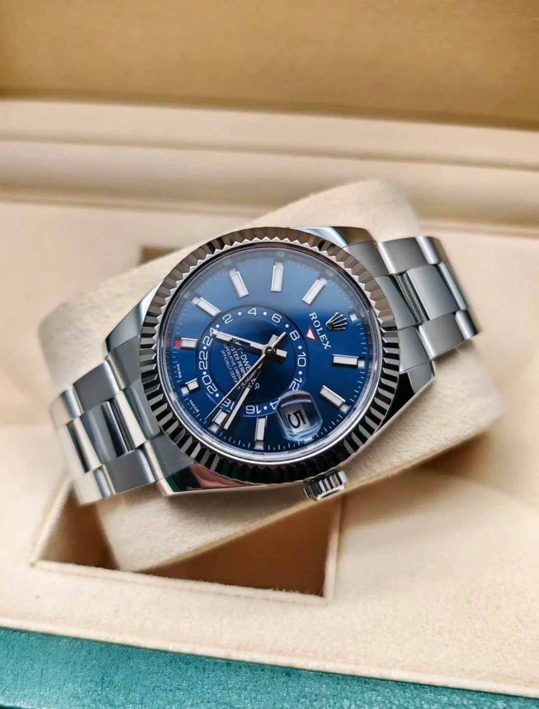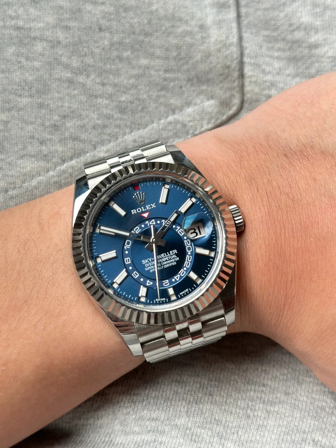 The Oyster Perpetual Sky-Dweller in Oystersteel and white gold with a bright blue dial and a Jubilee bracelet.