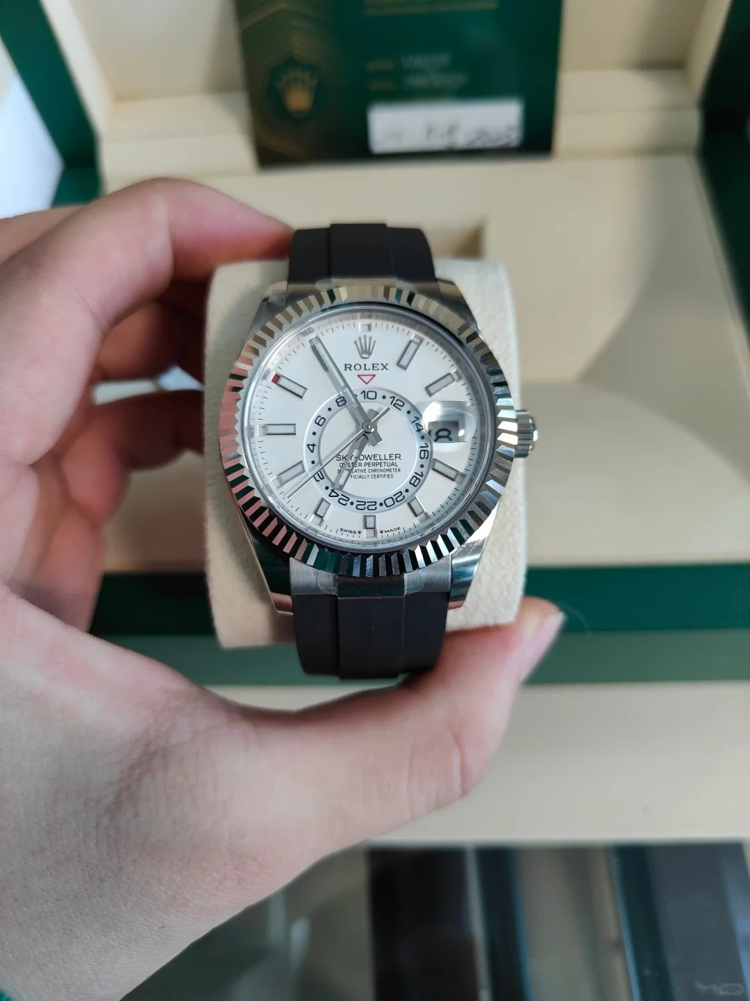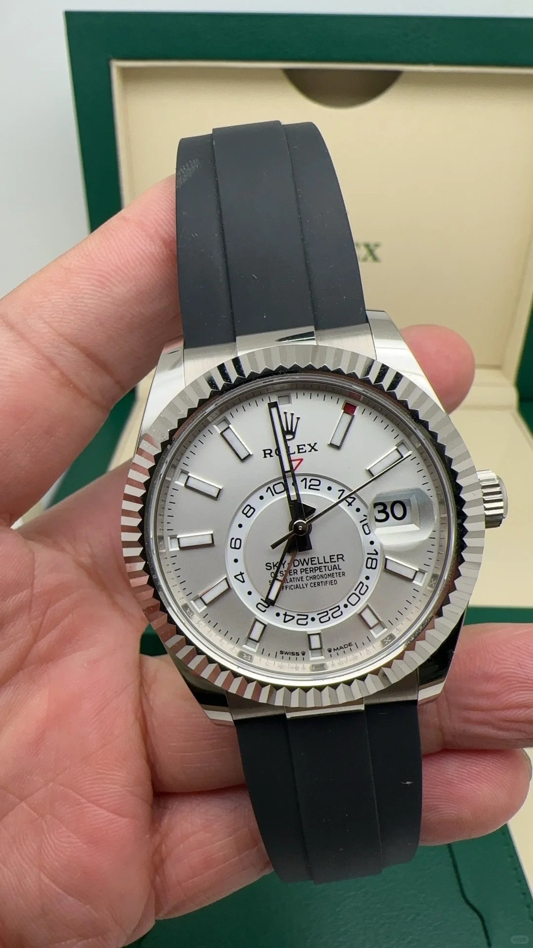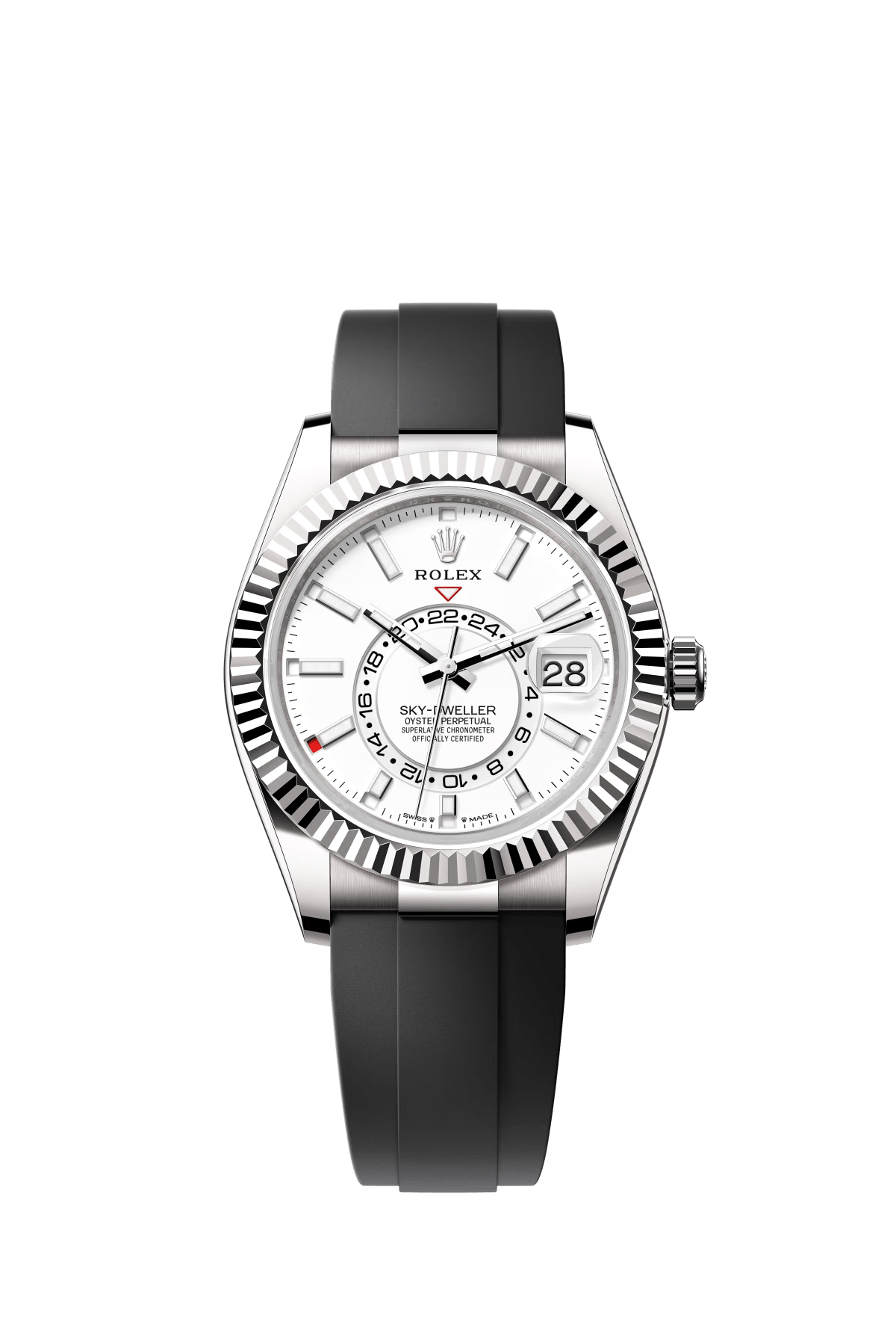 The Oyster Perpetual Sky-Dweller is available in 18 ct white gold with a glossy black dial and an Oysterflex strap. -m336239-0002 42mm