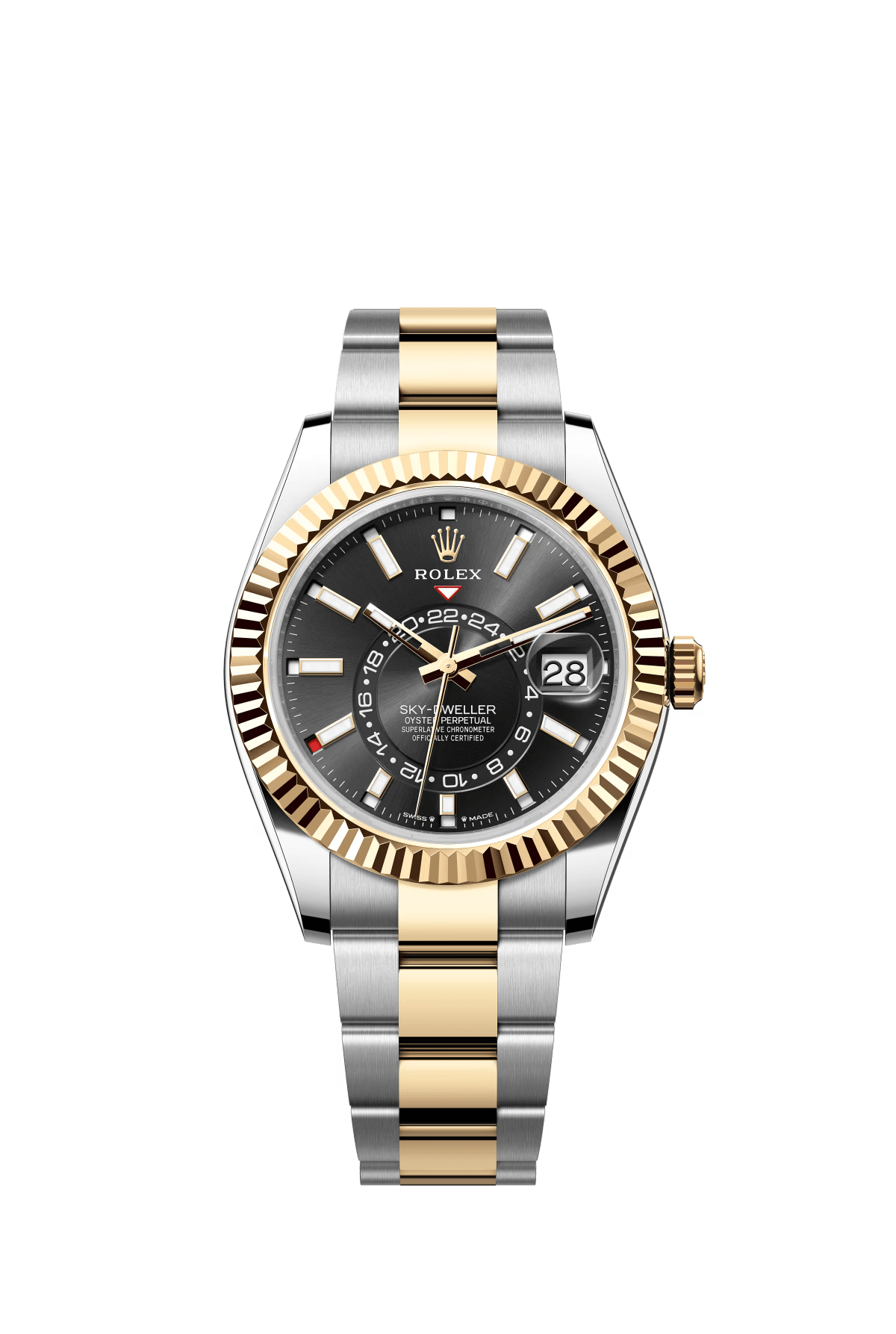 The Oyster Perpetual Sky-Dweller is available in yellow gold and Oysteel, with a glossy black dial and an Oyster bracelet. -m336933-0003 42mm