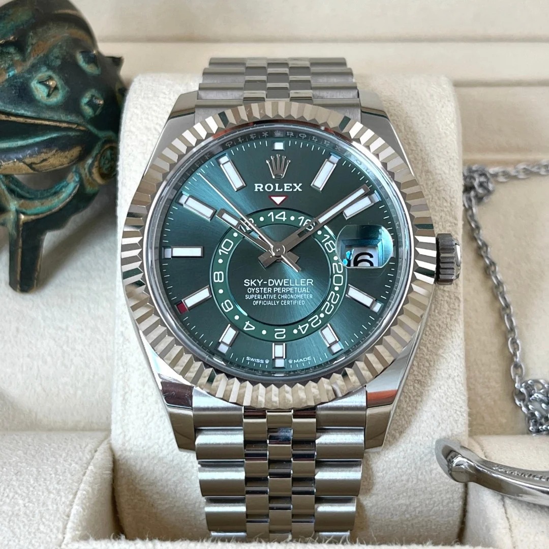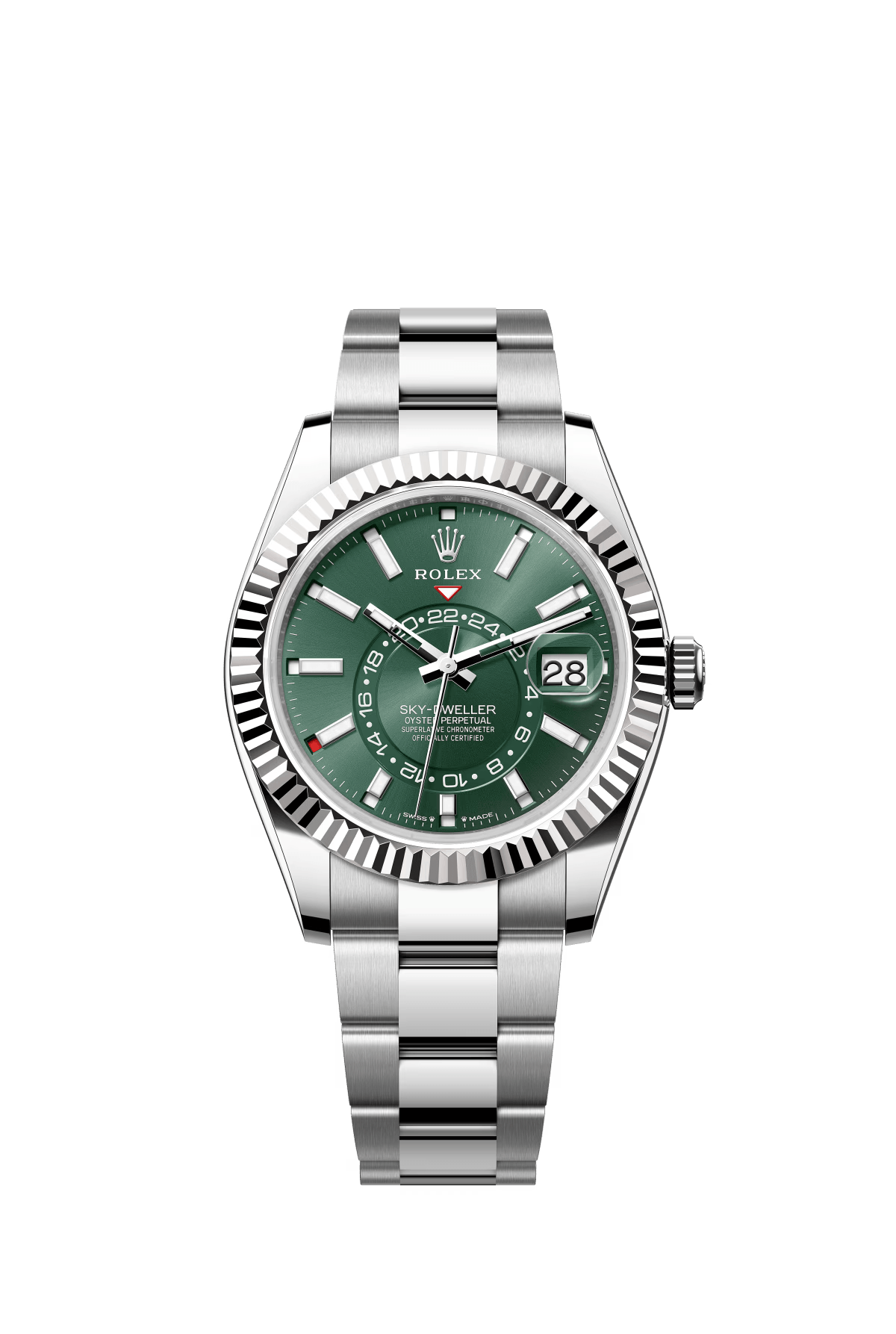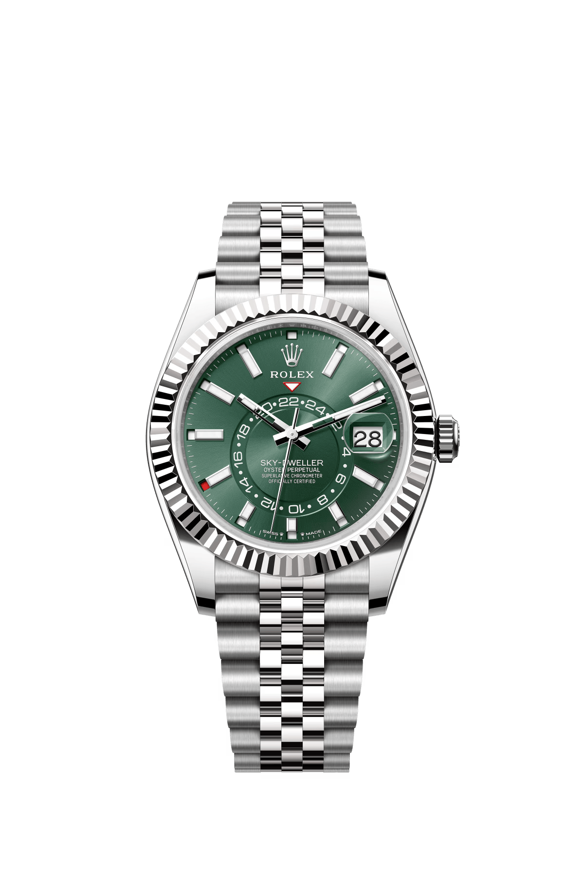 The Oyster Perpetual Sky-Dweller is available in white gold and Oysteel with a mint green dial and an Oyster bracelet. -m336934-0001 42mm