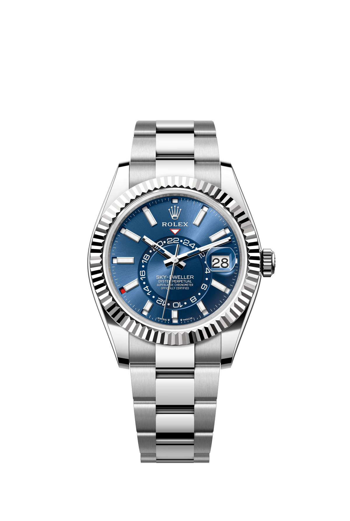 The Oyster Perpetual Sky-Dweller is available in white gold and Oystersteel with a bright blue dial and an Oyster bracelet. -m336934-0005 42mm