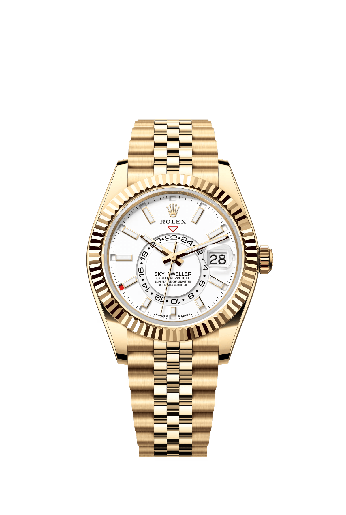 The Oyster Perpetual Sky-Dweller is available in 18 ct yellow gold with a white dial and a Jubilee bracelet. -m336938-0006 42mm