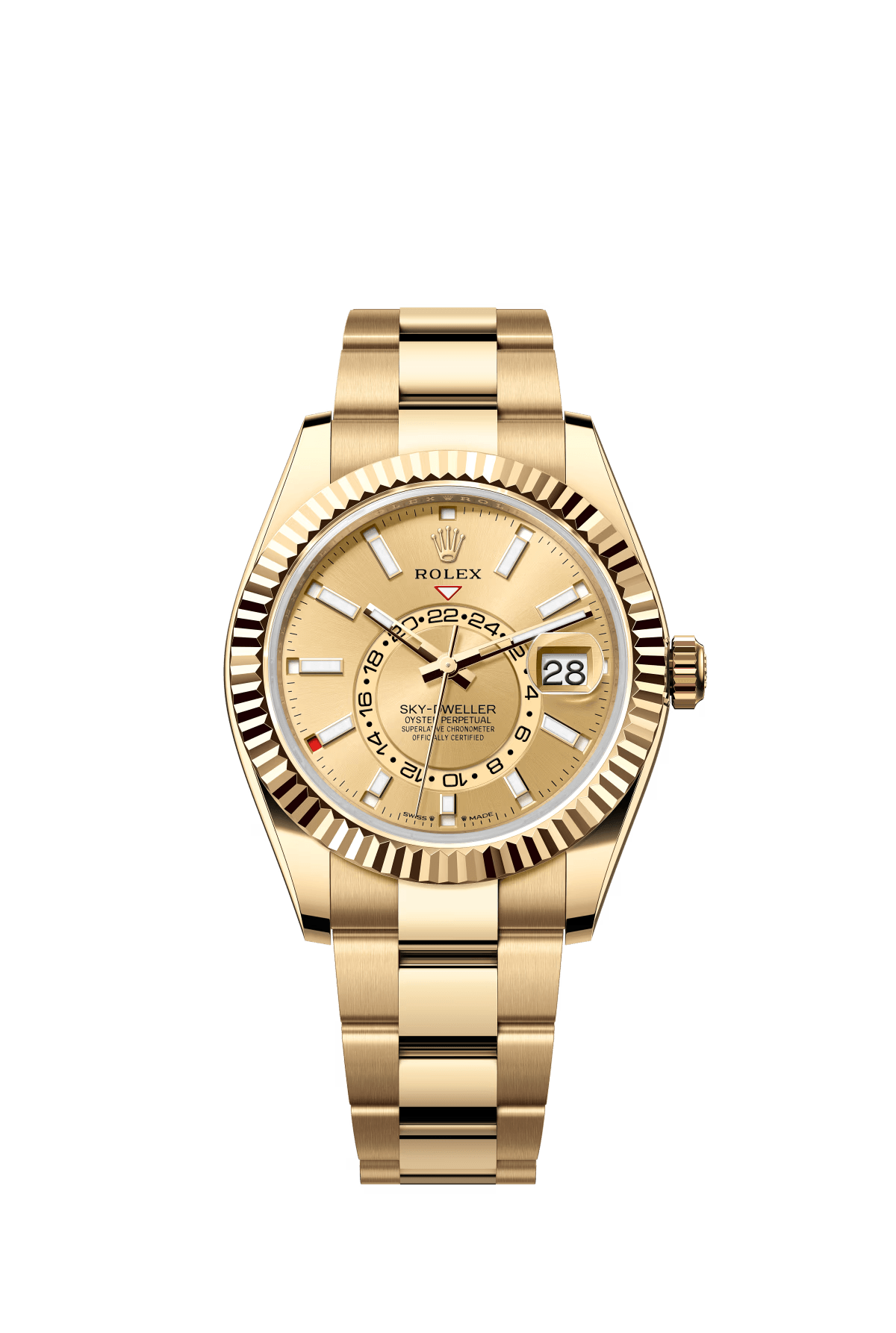 The Oyster Perpetual Sky-Dweller is available in 18 ct yellow gold with a champagne-coloured dial and an Oyster bracelet. -m336938-0001 42mm