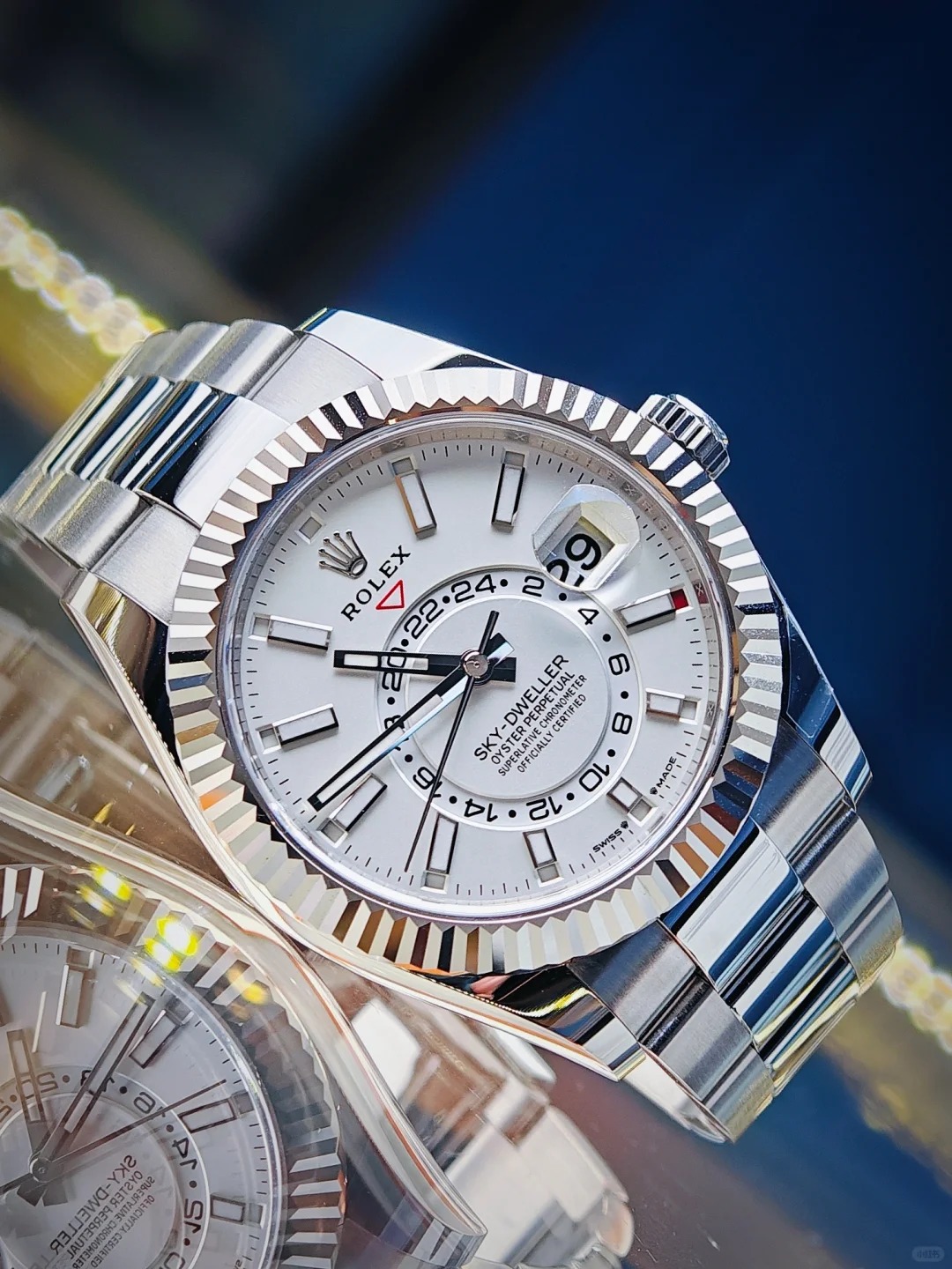 The Oyster Perpetual Sky-Dweller is available in white gold and Oyster steel with a mellow white dial and Oyster bracelet. -m336934-0003 42mm