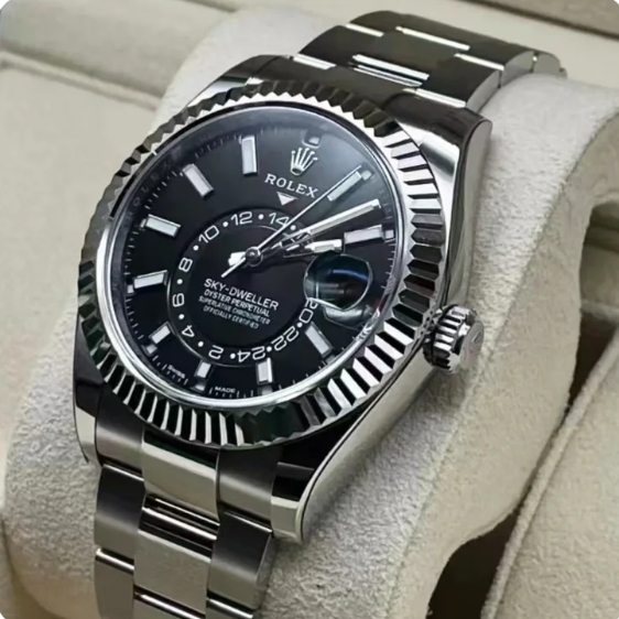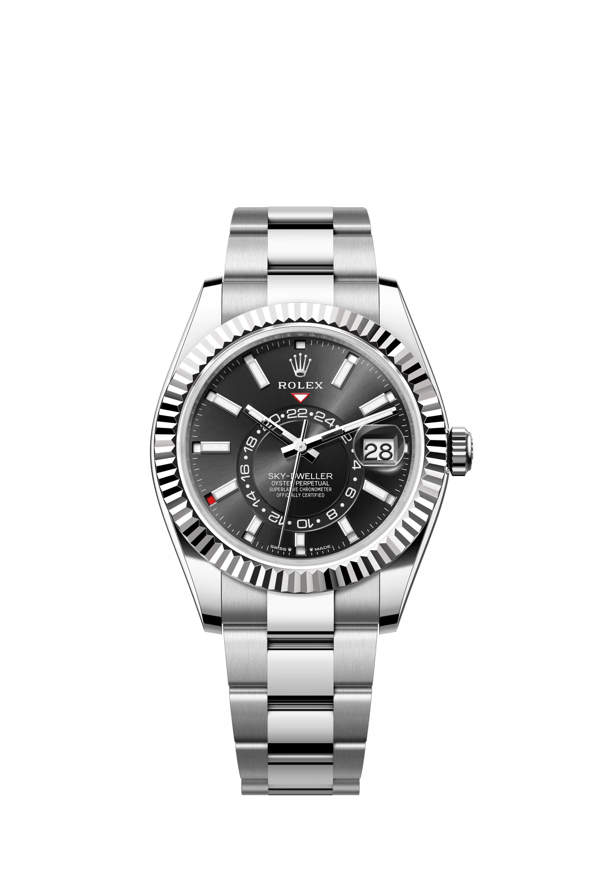 The Oyster Perpetual Sky-Dweller is available in white gold and Oysteel, with a glossy black dial and an Oyster bracelet. -m336934-0007 42mm