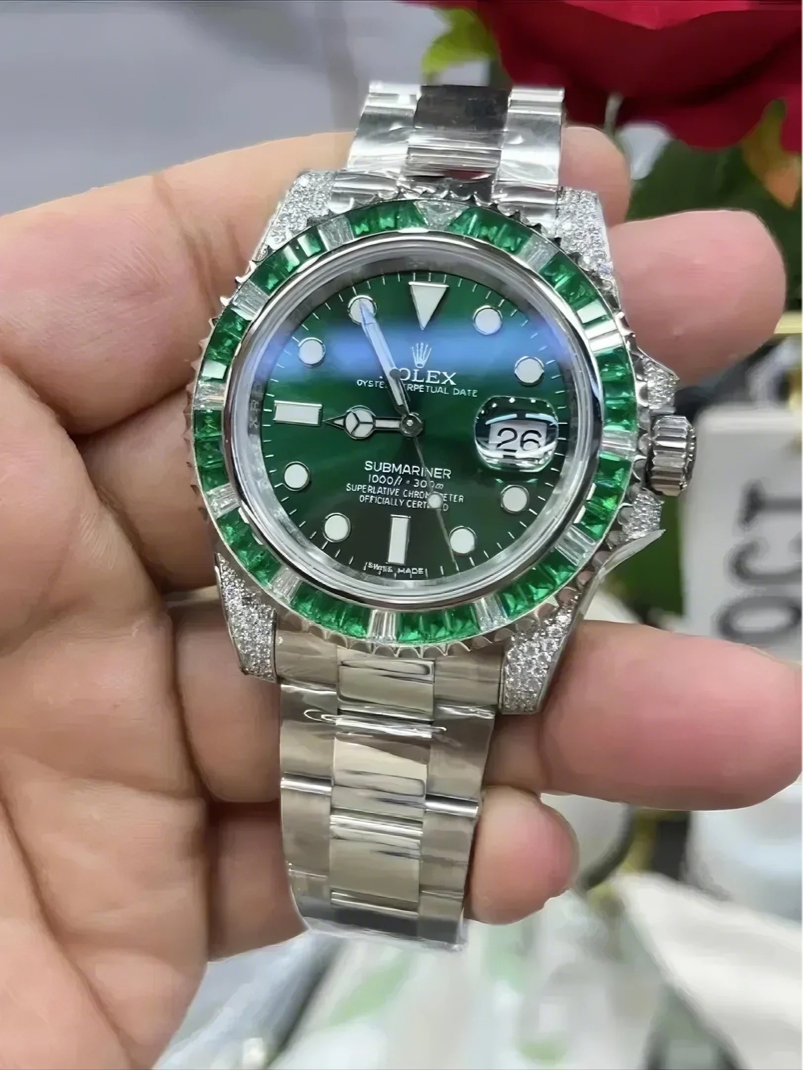 This is an 18K white gold Rolex Submariner 116659SABR. t includes an integral Rolex 18K white gold Oysterlock bracelet with a folding deployment clasp and a scratch resistant emerald crystal. It has a screwed down solid case back and Triplock winding crown protected by diamond set crown guards. The solid three-body 40 mm. diameter case, straight diamond set lugs, bracelet and flat knurled bezel, are polished and brushed. The graduated unidirectional revolving bezel is white gold and set with 27 b aguette cut emerald, and 11 baguette cut diamonds every 10 minutes, the dive triangle at the 60-minute position is set with a triangular diamond. It has a sunburst green dial with luminous white gold-set dot, baton, and arrow hour index markers, luminous white gold "Mercedes" style Rolex minute and hour hands, a center sweep second hand with a luminous "lollipop" indicator, a white minute/second perimeter chapter ring, and a cyclops magnification lens for the date aperture window at 3 o'clock. It's water resistant to 330 meter/1,000 feet, it has a 48-hour power reserve at full winding, and the 13mm thick case, dial, and movement are all signed.